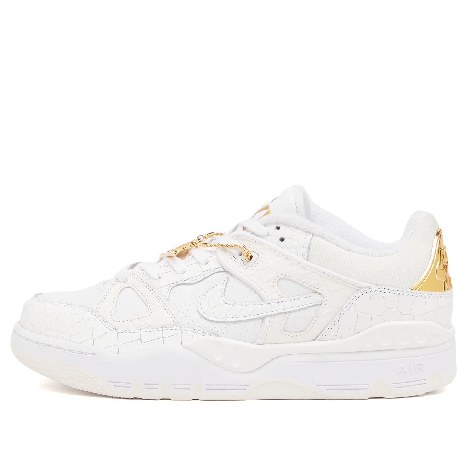 Legendary designer and creative Nigo puts another new spin on the underrated Nike Air Force 3 with this bold “White Croc” edition. Faux crocodile textures, a metallic gold Nike chain, and split Nigo Force branding bring the streetwear frontman’s edge to this slept-on silhouette. Finished with textured accents and a chunky sole for maximum impact, it’s not one you’ll want to miss. - Textile & Leather Upper - Lace Up Closure - Logo Charms - Nike Air Cushioning - Branded Details - Rubber Outsole - Product Code: HF7630-100