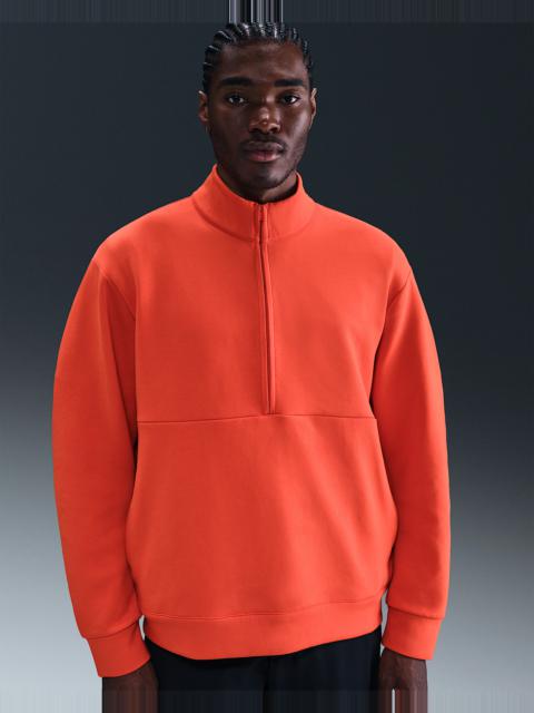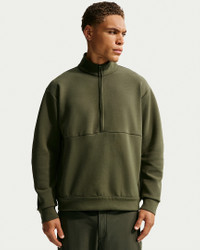 Extraordinarily soft and smooth, our ImpossiblySoft fabric feels made for all-day motion. This double-knit 1/2-zip top is built with clean lines and sweat-wicking Dri-FIT technology for the ultimate comfort on the go. Benefits - Nike Dri-FIT technology moves sweat away from your skin for quicker evaporation, helping you stay dry and comfortable. - Zippered pockets with an inner drop-in pocket provide easy-access storage. - Raglan sleeves and articulated elbow construction help you move freely and naturally. Product Details - Signature locker loop on back collar - 1/2-zip design - Body: 51% polyester/25% modal/15% cotton/9% spandex. Pocket Bags: 100% cotton. - Machine wash - Imported - Shown: Cargo Khaki/Sequoia - Style: HQ6953-325 SIZE & FIT Model is wearing size M and is 6′3″191cm Loose fit: roomy and relaxed Fits large; we recommend ordering a size down