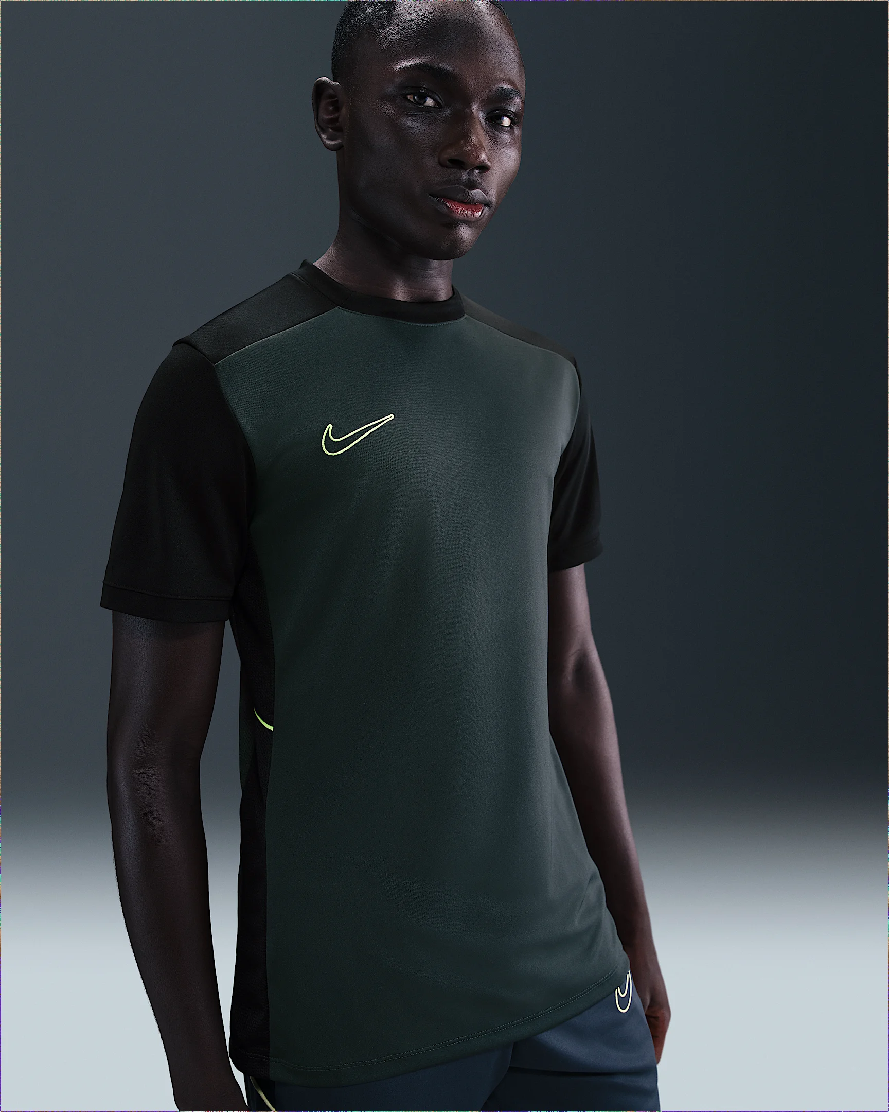 Built for soccer training, this Academy top feels ultralight and cool, with side mesh panels for extra airflow. Its slim fit gives a distraction-free feel as you push the pace through every drill and scrimmage. Benefits - Nike Dri-FIT technology moves sweat away from your skin for quicker evaporation, helping you stay dry and comfortable. - Smooth knit fabric feels light and cool. - Mesh side and back panels provide extra breathability. Product Details - Embroidered Swoosh logo - Body: 100% polyester. Mesh: 100% polyester. - Machine wash - Imported - Shown: Seaweed/Black/Limelight/Limelight - Style: HJ3791-390 SIZE & FIT Model is wearing size M and is 6′1″184cm Sm fit: sleek and tailored