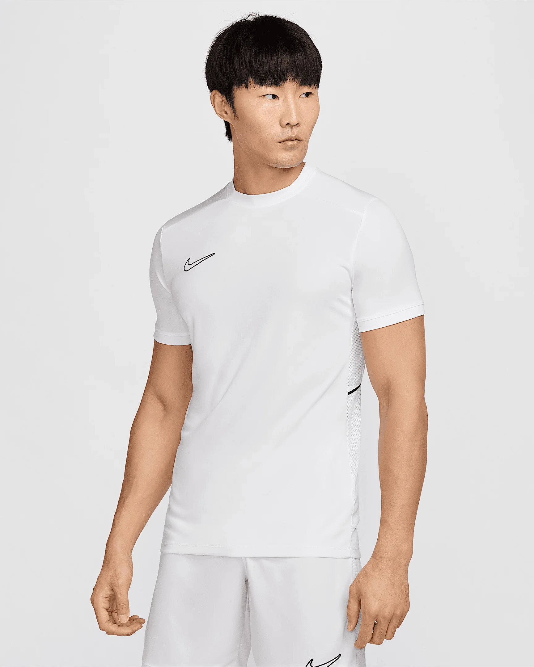 Built for soccer training, this Academy top feels ultralight and cool, with side mesh panels for extra airflow. Its slim fit gives a distraction-free feel as you push the pace through every drill and scrimmage. Benefits - Nike Dri-FIT technology moves sweat away from your skin for quicker evaporation, helping you stay dry and comfortable. - Smooth knit fabric feels light and cool. - Mesh side and back panels provide extra breathability. Product Details - Embroidered Swoosh logo - Body: 100% polyester. Mesh: 100% polyester. - Machine wash - Imported - Shown: White/White/Black/Black - Style: HJ3791-100 SIZE & FIT Model is wearing size M and is 6′2″188cm Sm fit: sleek and tailored