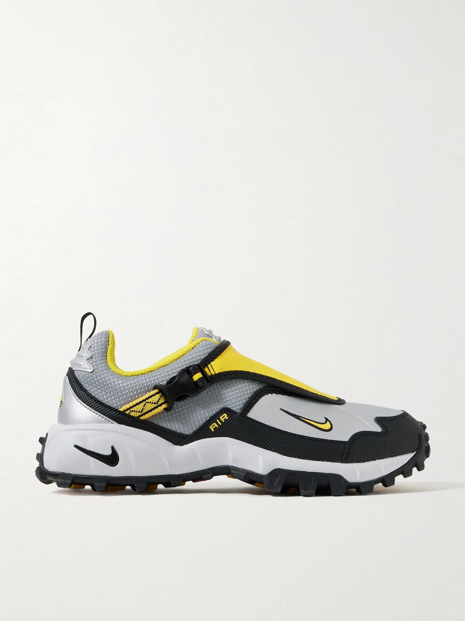 Pulled from the archives of the early noughties, Nike's 'ACG Phassad' sneakers have a buckle-fastening overlay inspired by tent flaps. They're made from panels of mesh and rubber and set on signature 'Air' soles that put a spring in every step. Size & Fit Fits true to size, please refer to Nike size guide below: - US 4 = UK 3.5/ EU 36 - US 4.5 = UK 4/ EU 36.5 - US 5 = UK 4.5/ EU 37.5 - US 5.5 = UK 5/ EU 38 - US 6 = UK 5.5/ EU 38.5 - US 6.5 = UK 6/ EU 39 - US 7 = UK 6/ EU 40 - US 7.5 = UK 6.5/ EU 40.5 - US 8 = UK 7/ EU 41 - US 8.5 = UK 7.5/ EU 42 - US 9 = UK 8/ EU 42.5 - US 9.5 = UK 8.5/ EU 43 - US 10 = UK 9/ EU 44 - US 10.5 = UK 9.5/ EU 44.5 - US 11 = UK 10/ EU 45 - US 11.5 = UK 10.5/ EU 45.5 - US 12 = UK 11/ EU 46 - US 12.5 = UK 11.5/ EU 47 - US 13 = UK 12/ EU 47.5 - US 13.5 = UK 12.5/ EU 48 - US 14 = UK 13/ EU 48.5 - Packaging reflects both men’s and women’s sizing Details & Care - Grey mesh, yellow, silver and black rubber - Lace-up, buckle-fastening strap - Designer colour: Black/ Metallic Silver/ Pure Platinum/ Yellow Zest - Style number: HM7133-001 - Nike follows its own size conversion, therefore the size stated on the box will differ from the one provided in our conversion chart. To receive your correct fit, please refer to Size and Fit notes