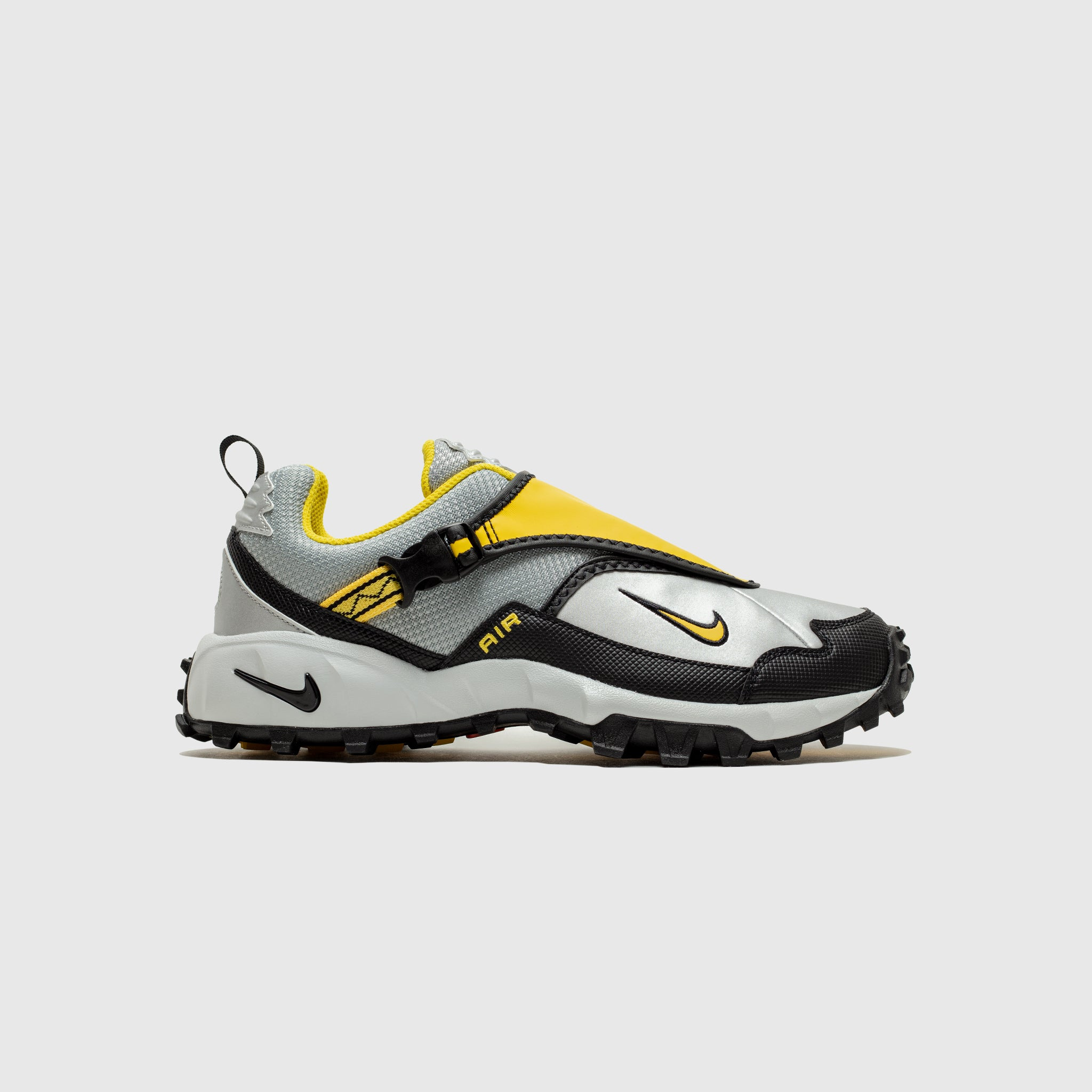 - HM7133 001 - Black/Yellow Zest-Metallic Silver - Nike ACG brings back the 2003 trail runner - Metallic silver mesh upper - Metallic silver leather and Black synthetic overlays - Metallic silver mesh tongue - Yellow zest shroud with buckle closure - Yellow zest TPU ACG branding on the back heel - Yellow zest embroidered swoosh on the lateral toe - Yellow zest "AIR" branding on the lateral side - White rubber midsole - Black rubber outsole
