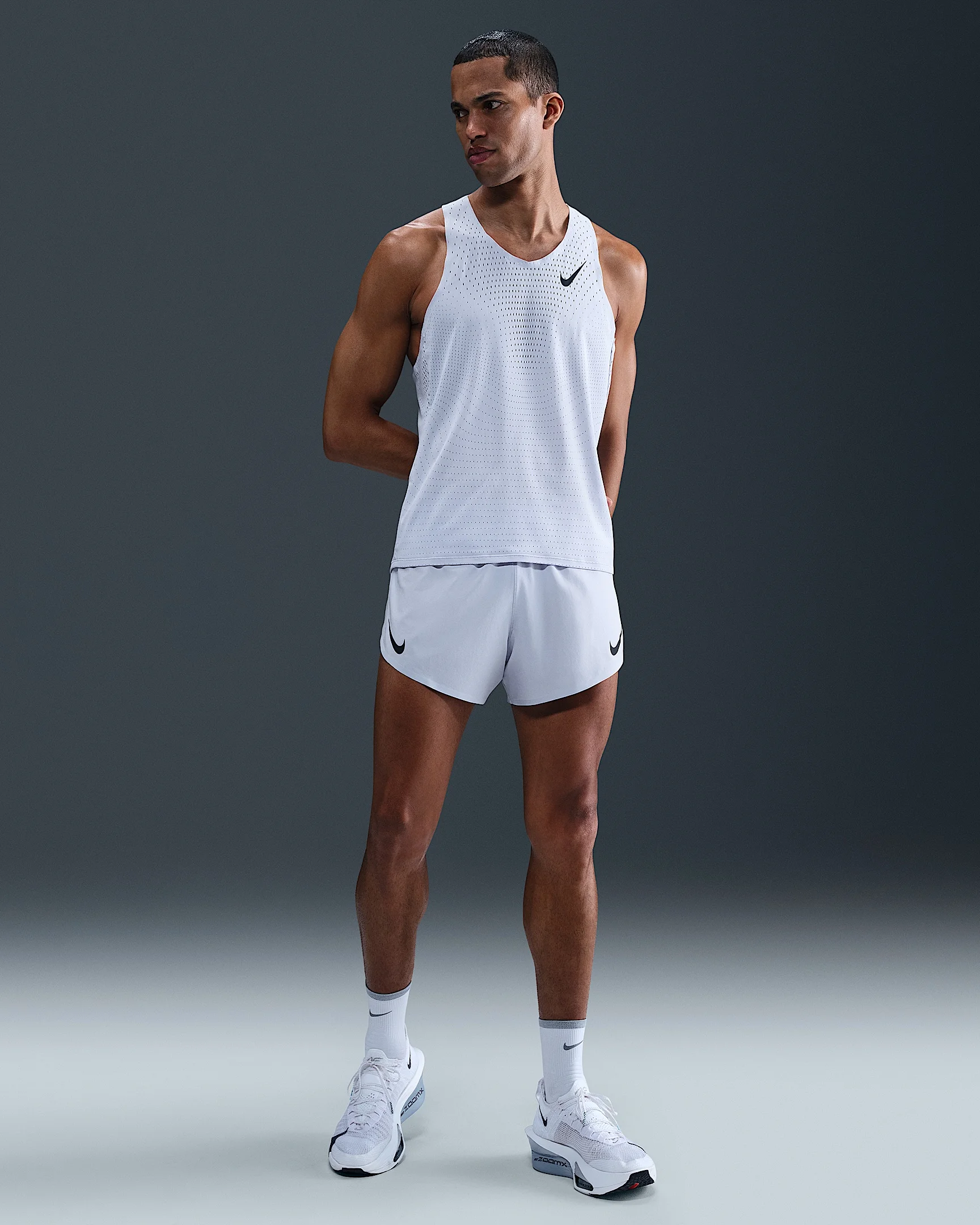 Designed for racing, the 4" AeroSwift shorts help you push through the worst to compete with the best. Their lightweight woven material helps wick sweat with every mile, and a knit liner gives the support you need. A total of 4 drop-in pockets give you a place to stash your gels, snacks and other race-day essentials. More Benefits - Designed for Racing - Length: 4" - Liner: Knit liner - Fabric: Lightweight woven - Storage: 4 drop-in pockets and zippered back pocket - Waistband: Elastic with drawcord Product Details - Body: 88% polyester/12% spandex. Elastic: 73% nylon/27% spandex. Lining: 89% polyester/11% spandex - Machine wash - Imported - Not intended for use as Personal Protective Equipment (PPE) - Shown: Ghost/Black - Style: FN3352-057 SIZE & FIT Model is wearing size M and is 6′2″187cm Standard fit: easy and traditional