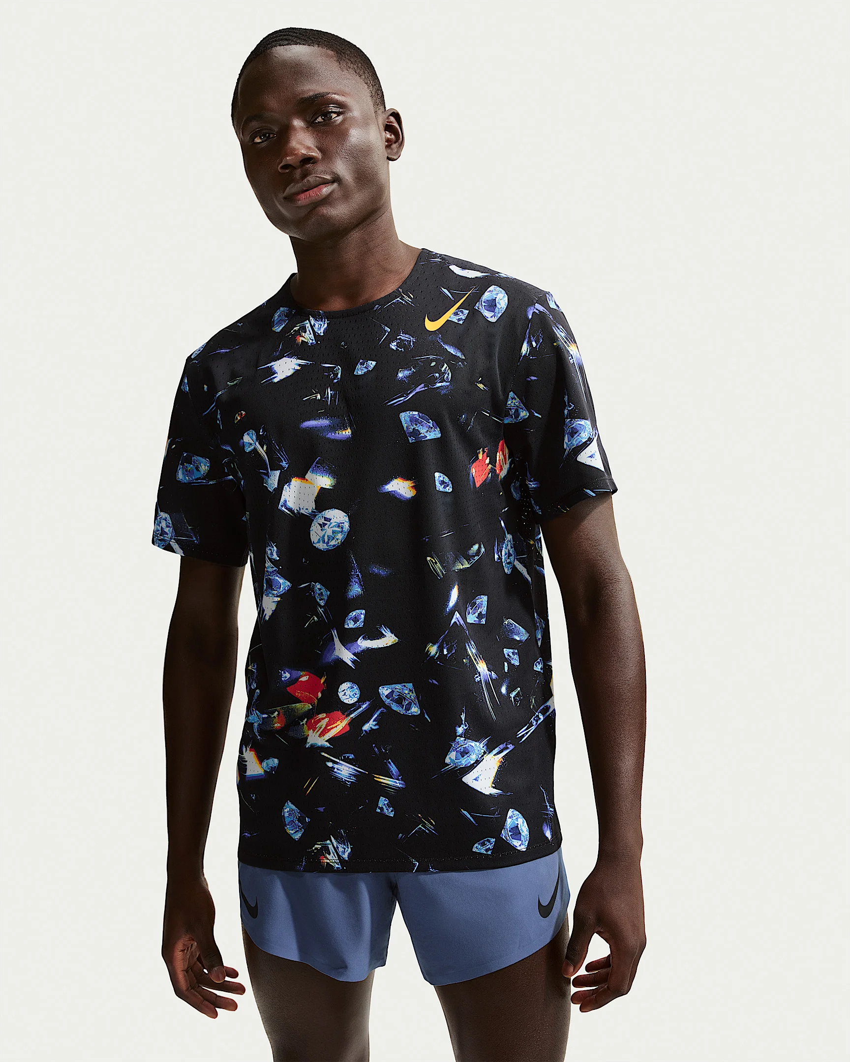 Inspired by the diamond trophy, this sweat-wicking knit top was built for speed. It's lightweight and ultrabreathable, helping keep you dry and cool through the finish line. Benefits - Nike Dri-FIT ADV levels up our sweat-wicking technology with advanced cooling and zones of breathability to help you stay dry and comfortable. - Engineered knit fabric is lightweight and breathable. - Bonded seams at the shoulder reduce bulk for a lighter feel. Product Details - Nonreflective Swoosh logo - 100% polyester - Machine wash - Imported - Shown: Black/Laser Orange - Style: IH5043-010 SIZE & FIT Model is wearing size M and is 6'1"184cm Standard fit: easy and traditional