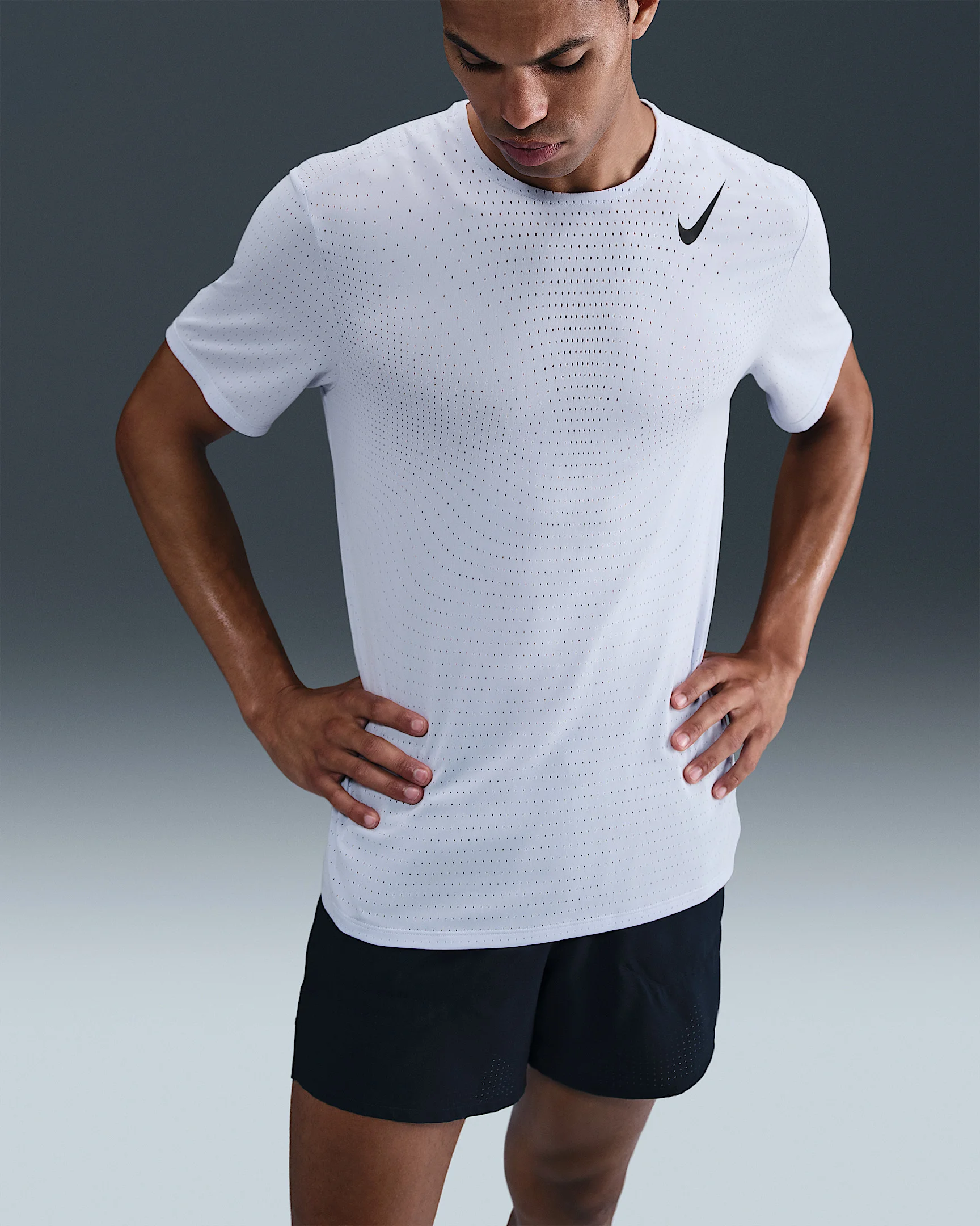 Built for speed, the AeroSwift collection is our pinnacle racing gear. This sweat-wicking engineered-knit top is lightweight and ultra-breathable to help keep you cool through the finish line. Benefits - Nike Dri-FIT ADV technology combines moisture-wicking fabric with advanced engineering and features to help you stay dry and comfortable. - Engineered knit fabric is lightweight and breathable. - Bonded seams at the shoulder reduce bulk for a lighter feel. - Swoosh logos have a non-reflective finish that won't catch flash photography during the race. Product Details - 100% polyester - Machine wash - Imported - Shown: Ghost/Black - Style: HJ3377-057 SIZE & FIT Model is wearing size M and is 6′2″187cm Standard fit: easy and traditional
