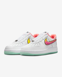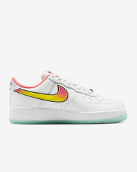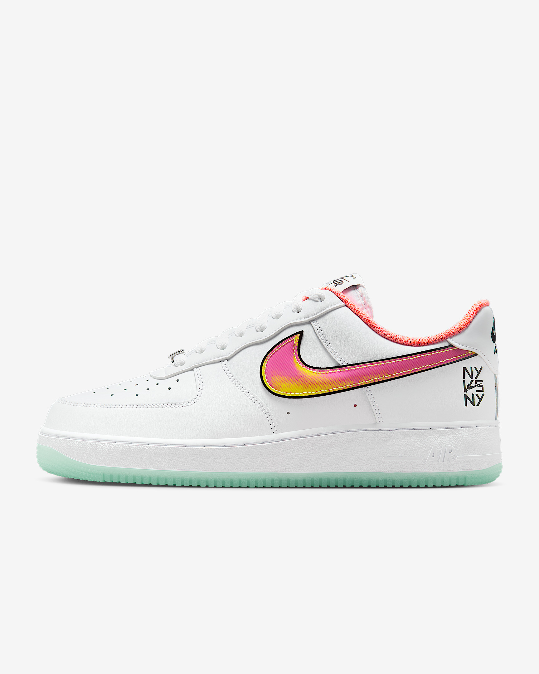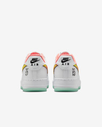 The energy of NYC summer hoops comes alive in this special edition AF1. Crisp leather pairs with a translucent sole and hidden design details to celebrate some of the best young hoopers in New York City’s premiere streetball tournament. Benefits - Lenticular Swoosh logo, "NY" dubrae and special edition sockliner bring energy to this classic - Real and synthetic leather upper with perforated toe box is breathable and comfortable. - Originally designed for performance hoops, the Nike Air unit provides lightweight cushioning. - Rubber outsole with heritage hoops pivot circles delivers traction and durability. Product Details - Extra laces - Padded collar - Shown: White/Green Glow/Light Laser Orange/Crimson Pulse - Style: IH4962-100