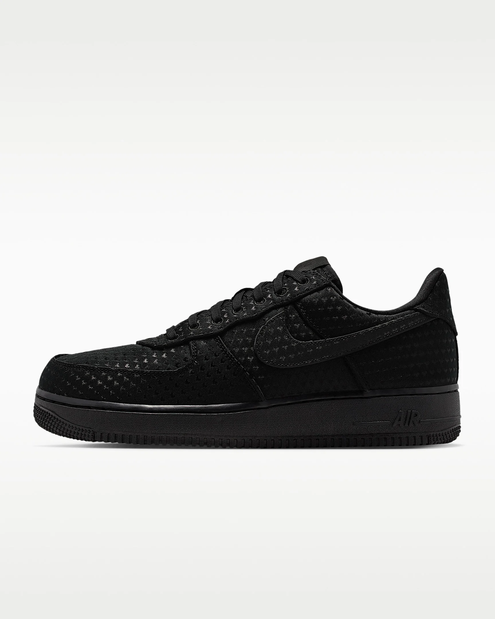 The classic AF1 gets a charming redesign. Monochromatic textiles covered in subtle hearts—what's not to love? Benefits - Textile upper is durable and comfortable. - Originally designed for performance hoops, Nike Air cushioning adds lightweight, all-day comfort. - Rubber outsole with heritage hoops pivot circles delivers traction and durability. Product Details - Shown: Black/University Red/Black - Style: IB6836-001