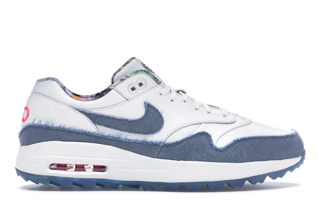 Nike pays tribute to Pebble Beach, the host course of the 2019 U.S. Open, and its strict golf dress code with the Nike Air Max 1 Golf No Denim Allowed. Presented in a color scheme of Blue Void, Hyper Pink, and Thunderstorm, primarily centered around blue, the Nike Air Max 1 Golf No Denim Allowed boasts a white leather upper adorned with frayed twill on the Swoosh and mudguard. This design element introduces a distinctive texture, elevating the shoe's visual allure. Embodying the course’s 100th anniversary, the shoe integrates an official logo on the tongue, a wildflower graphic inside, and an infinity sign at the heel. The outsole exhibits a golf-specific traction pattern with a floral graphic, enhancing grip on the course. With Nike's Air technology, the shoe ensures superior comfort and support. The noteworthy aspect of the Nike Air Max 1 Golf No Denim Allowed is its golf-focused traction pattern on the clear outsole. This innovative feature significantly enhances traction on the golf course, ultimately improving the wearer’s performance. The golf-ready shoe debuted on June 10, 2019, for $140. - Style CI6876-100 - Colorway White/Hyper Pink-Thunderstorm - Retail Price 140 - Release Date 2019-06-10 - Featured false - Product Line Nike Air Max