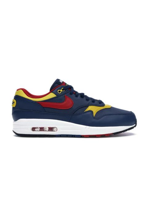 The Nike Air Max 1 Mini Swoosh Work Blue recreates the layered construction of the original Tinker Hatfield AM1 design from 1987 and dresses it in the colors of the sky. The Work Blue Nike Air Max 1 with a Swoosh begins with an upper of breathable pale blue textile overlaid with tonal suede at the toe cap, mudguard, eye stays, quarter panel, and heel. Darker blue suede hits the midfoot, matches the laces, and the leather Nike Swoosh coursing across the side panel. Embroidered "Nike Air" branding hits the heel in white and matches the branding on the blue tongue tag. The sail-colored foam midsole offers springy cushioning, and the primary sail rubber outsole sports grooves and waffle lugs for grip. The standout aspect of this shoe that we enjoy is adding a sunny goldenrod color that provides contrast. These hits of yellow appear on the outsole, in the tinting of the visible Air cassette in the midsole, and the embroidery of the Nike Swoosh on the lateral forefoot. The Nike Air Max 1 Mini Swoosh Work Blue was released on August 10, 2018, for $130 retail. - Style 875844-404 - Colorway Work Blue/Yellow Ochre-Mountain Blue - Retail Price 130 - Release Date 2018-08-10 - Featured false - Product Line Nike Air Max