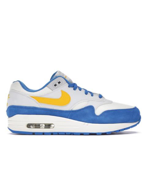 The Nike Air Max 1 White Photo Blue Black features a white, Total Orange, black, and Photo Blue leather and suede upper with plain white acting as the base and suede overlays in black wrapping around it to add some stark contrast to the whole look. From there, Photo Blue makes its appearance in the form of vibrant Nike "Swoosh" logos, and Total Orange outfits the heels with further branding, anchoring the shoe with an Air Max midsole unit to complete the design. The Nike Air Max 1 White Photo Blue Black released in April of 2019 and retailed for $110. - Style AH8145-112 - Colorway White/Total Orange-Black-Photo Blue - Retail Price 110 - Release Date 2019-04-20 - Featured false - Product Line Nike Air Max