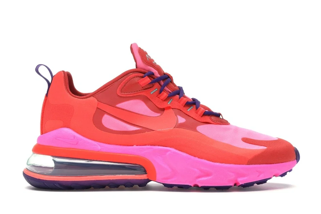 The Nike Air Max 270 React Electronic Music is a special edition of the popular Air Max 270 React silhouette that draws inspiration from the dynamic world of electronic music. The upper of the Air Max 270 React Electronic Music features a combination of materials that prioritize both comfort and style. Breathable mesh is utilized for optimal airflow, while overlays crafted from durable synthetic materials offer structure and support. The color palette is rich and diverse, often featuring bright neon colors in pink, red and orange that capture the electric energy of electronic music scenes. These colors are strategically applied across the upper. The Nike Air Max 270 React Electronic Music features the large Max Air unit in the heel, providing cushioning and comfort for all-day wear. The React foam midsole, a feature our specialists appreciate, offers a responsive and supportive feel, enhancing the sneaker's performance capabilities. The shoe was available for purchase on 19th September 2019 with a retail price of $150. - Style AO4971-600 - Colorway Mystic Red/Pink Blast/Habanero Red/Bright Crimson - Retail Price 150 - Release Date 2019-09-19 - Featured false - Product Line Nike Air Max