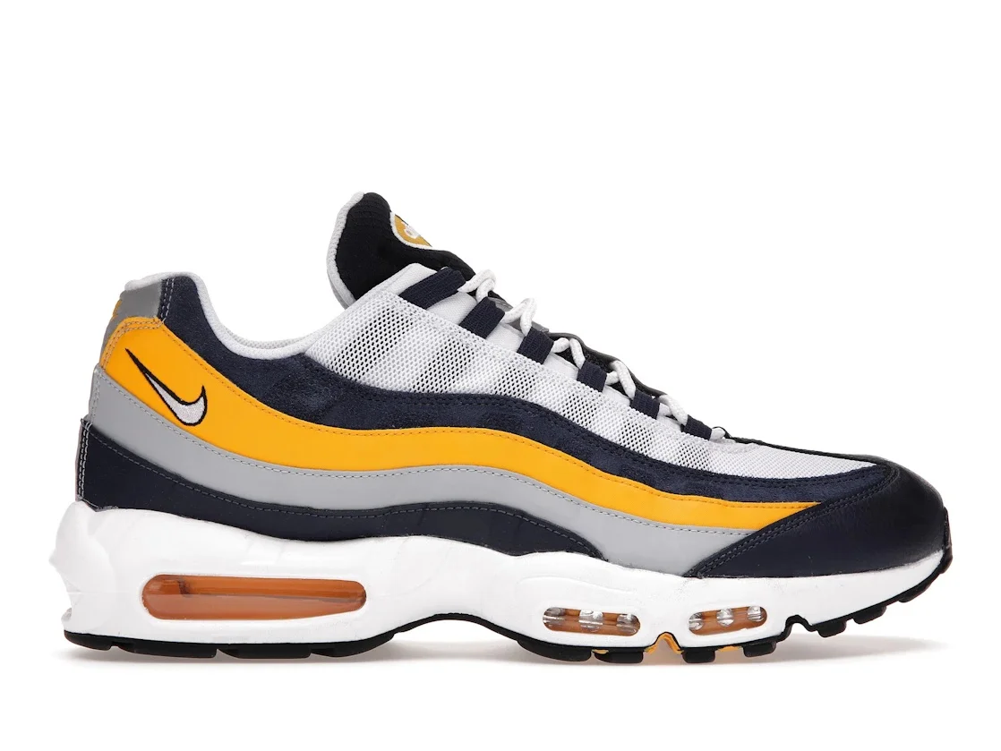The Nike Air Max 95 Michigan is a stylish and comfortable sneaker that is perfect for everyday wear. This shoe features a classic design with a mix of blue and yellow colors that pay homage to the University of Michigan. The upper is made of a combination of leather, mesh, and synthetic materials, providing durability and breathability. The midsole is equipped with Nike's signature Air Max technology, which offers superior cushioning and support. The outsole is made of rubber, providing excellent traction on various surfaces. The Nike Air Max 95 Michigan was released on April 27, 2021, and retails for $170. This shoe is a must-have for sneaker enthusiasts and Michigan fans alike. - Style CZ0191-400 - Colorway White/Navy-Varsity Maize - Retail Price 170 - Release Date 2021-04-27 - Featured false - Product Line Nike Air Max