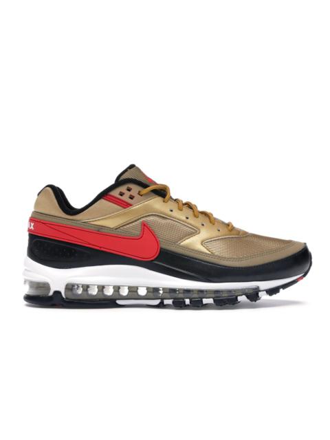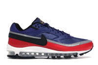 The Nike Air Max 97 BW Deep Royal Blue Black University Red is a colorful low-top basketball shoe. Its upper is constructed from blue synthetic leather and textile mesh, with a red strip running down the middle and a thin reflective silver lining running just above it. Black rubber swooshes decorate the side, wrapping around the ankle. The Nike Air Max 97 BW Deep Royal Blue Black University Red is a combination of Nike’s Air Max BW and Air Max 97 silhouettes from designer Christian Tresser. Nike Air technology is built into the soles, making them largely translucent except for the black rubber outsole and white midsole. Nike Air branding appears on the tongue and ankle. What our experts like most about the Nike Air Max 97 BW Deep Royal Blue Black University Red is its bold colorway. It was originally released November 22, 2018, and sold at a retail price of $170. - Style AO2406-400 - Colorway Deep Royal Blue/Black-University Red - Retail Price 170 - Release Date 2018-11-22 - Featured false - Product Line Nike Air Max