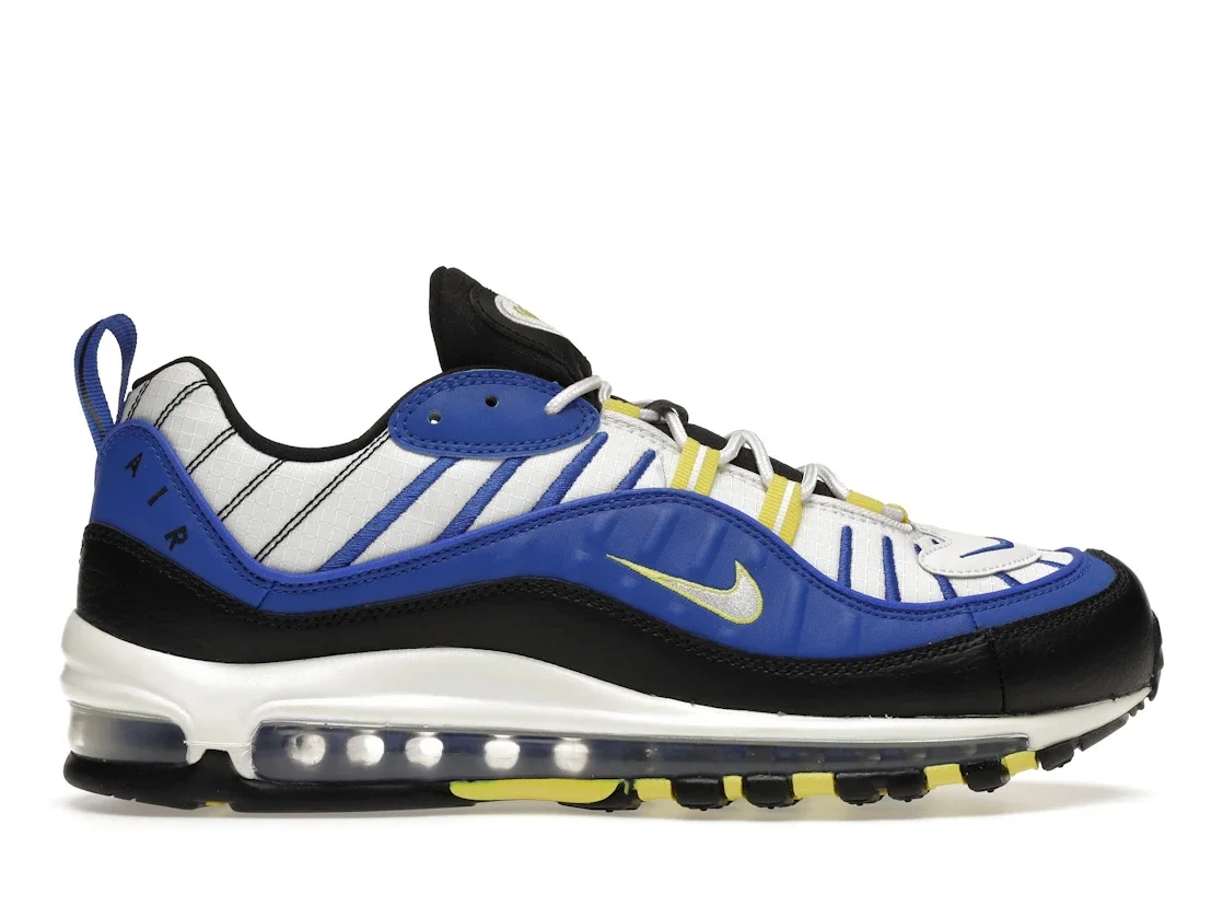 The Nike Air Max 98 Entourage sneakers take on a contrasting black, blue, and yellow theme on a white-based upper. The Air Max 98 Entourage sports branding and detailing across its construction from top to bottom. Reminiscent of the Lebron 8 V2 Entourage, the Air Max 98 Entourage starts things off with a white base while black and blue overlays cover it. To give the silhouette pops of color, yellow eyestays and straps are incorporated into the build. You'll notice a similar dynamic yellow laced with racer blue on the Air Max sole unit. The sneakers feature a dynamic yellow Swoosh on the blue overlay as well as Air branding on the heel tab, which is done in black. To keep things neat, a white midsole separates the contrasting colorways on the upper and rubber outsole. What our experts love about the Nike Air Max 98 Entourage is the yellow contrasting accents that give the sneaker its entourage vibe. The sneaker was released on September 16, 2019, retailing for $160. - Style 640744-400 - Colorway Racer Blue/Black-Dynamic Yellow-White - Retail Price 160 - Release Date 2019-09-16 - Featured false - Product Line Nike Air Max