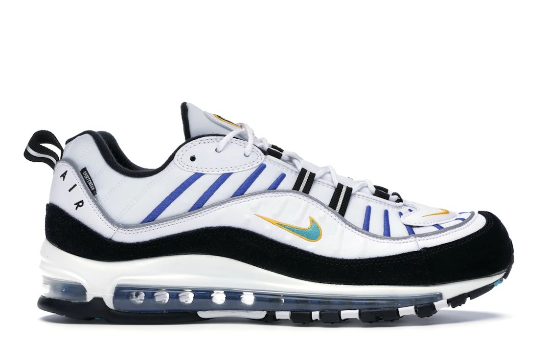 The Nike Air Max 98 White Teal Nebula University Gold is an iteration of the Air Max 98 in a white, Teal Nebula, and University Gold colorway. This Air Max 98 features a white upper with Bright Blue stripes and University Gold hits on the Swooshes and Nike Air branding on the lateral heel of the left shoe. Black detailing on the mudguard, eyelets, pull tab, and sock liner contrasts the upper. Teal accents appear on the miniature Swoosh embroidered on the lateral with a University Gold outline. Other details include clean round laces, ‘AirMax’ branding on the tongue, a thin strip of 3M reflective detailing that runs throughout, and branded insoles. A white sole unit with a full-length visible Max Air Window rests on a black and white rubber outsole. Our experts particularly love this sneaker’s distinctive colorway and premium design, which give it a bold and eye-catching look. The Nike Air Max 98 White Teal Nebula University Gold was released on June 5th, 2019, retailing at $170. - Style BV0989-102 - Colorway White/University Gold-Black-Teal Nebula - Retail Price 170 - Release Date 2019-06-05 - Featured false - Product Line Nike Air Max