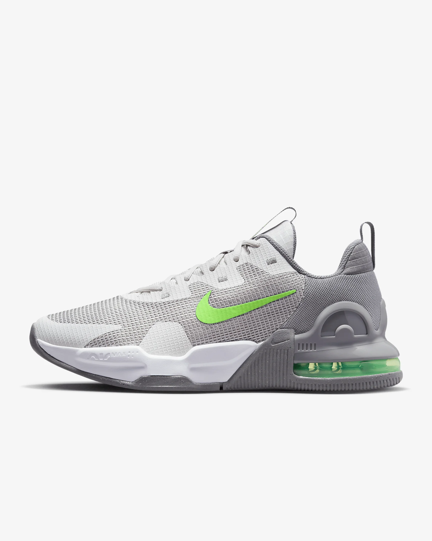 Finish your last rep with power and rack it with a roar that stuns the gym floor in the Nike Air Max Alpha Trainer 5. Max Air cushioning offers comfortable stability for lifting whether it’s a light or heavy day. A wide, flat base gives you enhanced stability and grip for all kinds of tough workouts without sacrificing style, as you roam from station to station and set to set. Product Details - Durable, breathable mesh in upper - Heel pull tab - Shown: Phantom/White/Flat Pewter/Green Strike - Style: DM0829-009
