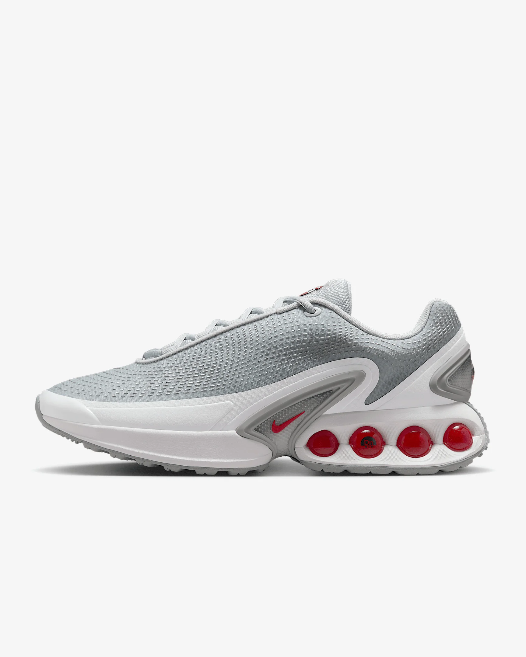 Say hello to the next generation of Air technology. The Air Max Dn features our Dynamic Air unit system of dual-pressure tubes, creating a reactive sensation with every step. This results in a futuristic design that’s comfortable enough to wear from day to night. Go ahead—Feel the Unreal. Product Details - Matte accents - Foam midsole - Rubber outsole - Not intended for use as Personal Protective Equipment (PPE) - Shown: Pure Platinum/Wolf Grey/Metallic Silver/University Red - Style: DV3337-018