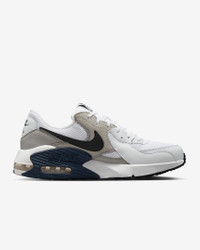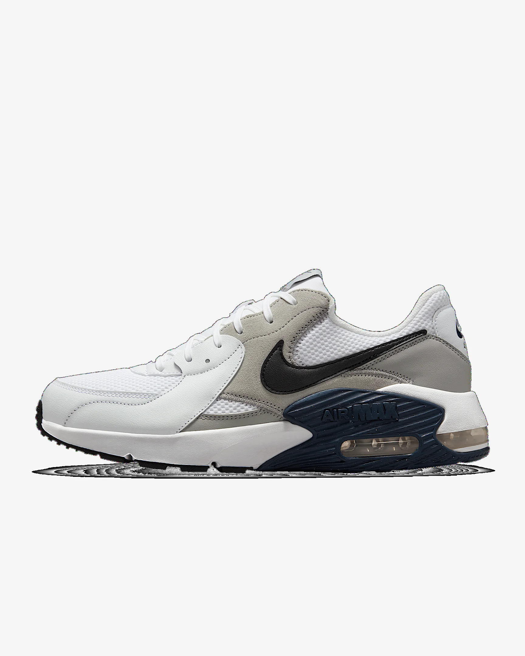 Get into the groove with the Nike Air Max Excee, with subtle pops of fresh color for style that defies time. Inspired by the Nike Air Max 90, these kicks deliver a modern twist on a legendary icon through elongated design lines and distorted proportions. Benefits - Max Air unit adds optimal cushioning and is visible through three windows for a truly modern look. - Elongated design lines honor the Air Max 90 while modernizing these kicks in a fresh way. - Stitched overlays add heritage styling and durability. - Padded, low-cut collar looks sleek and feels comfortable. Product Details - Foam midsole - Rubber outsole - Shown: White/Light Smoke Grey/Midnight Navy/Black - Style: FZ5486-104
