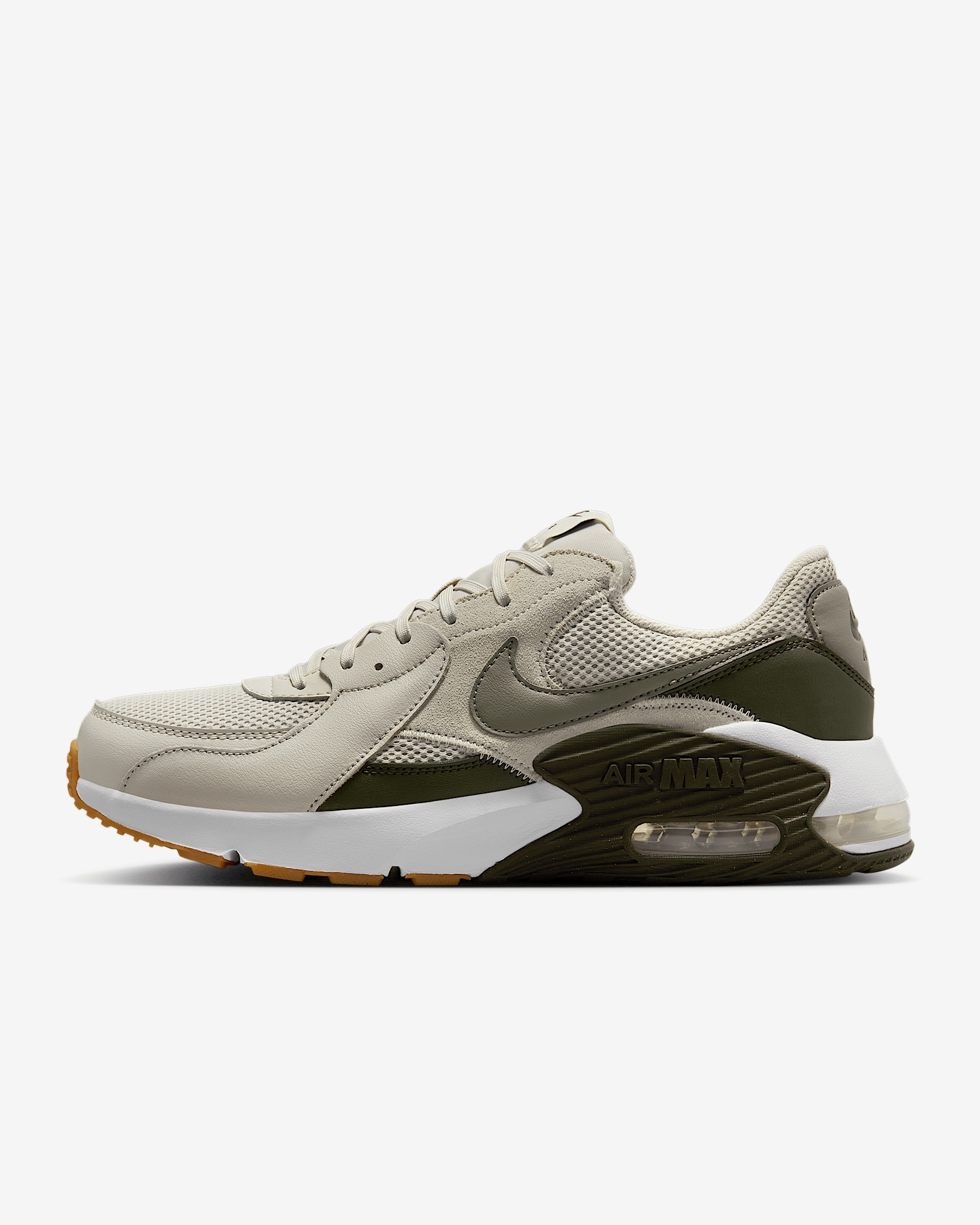 Get into the groove with the Nike Air Max Excee, with subtle pops of fresh color for style that defies time. Inspired by the Nike Air Max 90, these kicks deliver a modern twist on a legendary icon through elongated design lines and distorted proportions. Benefits - Max Air unit adds optimal cushioning and is visible through three windows for a truly modern look. - Elongated design lines honor the Air Max 90 while modernizing these kicks in a fresh way. - Stitched overlays add heritage styling and durability. - Padded, low-cut collar looks sleek and feels comfortable. Product Details - Foam midsole - Rubber outsole - Shown: Light Bone/Cargo Khaki/Phantom/Light Army - Style: FZ5486-003