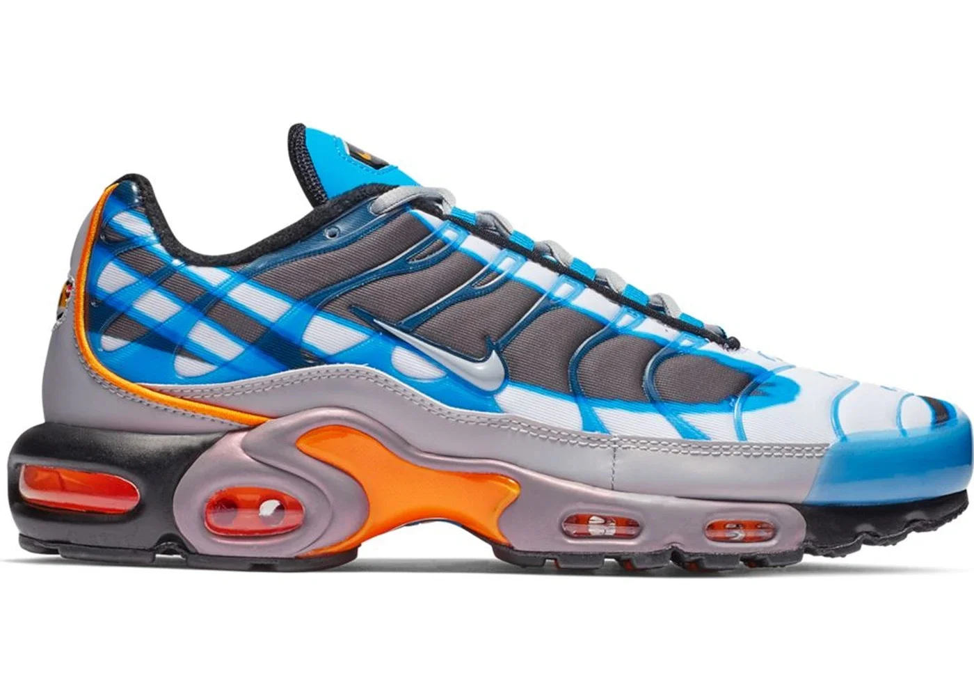 The Nike Air Max Plus Deluxe is designed to give you the best of two sneakers, the Air Max Plus and the Air Max Deluxe. The Air Max Plus Deluxe has an upper comprised of wave-like white, wolf grey, mesh, and blue mesh with translucent photo blue TPU overlays. The heel and mudguard have reflective panels with an orange strip detailing the edges. The tongue tab is blue and features the Nike swoosh in orange with a black wide honeycomb tag. The grey laces go through blue webbed eyelets for the shoe’s closure. What design elements of the Nike Air Max Plus Deluxe do we like? Our StockX experts like the sole that resembles the Air Plus Max, with the visible Air Units. It has a grey midsole with an orange accent in the middle. The front sole and heel are solid black, just like the outer sole. Nike released the Air Max Plus Deluxe on 9th February 2019 for $170. - Style 815994-400 - Colorway Photo Blue/Wolf Grey-Orange Peel-Black-White-Metallic Silver - Retail Price 170 - Release Date 2019-02-09 - Featured false - Product Line Nike Air Max