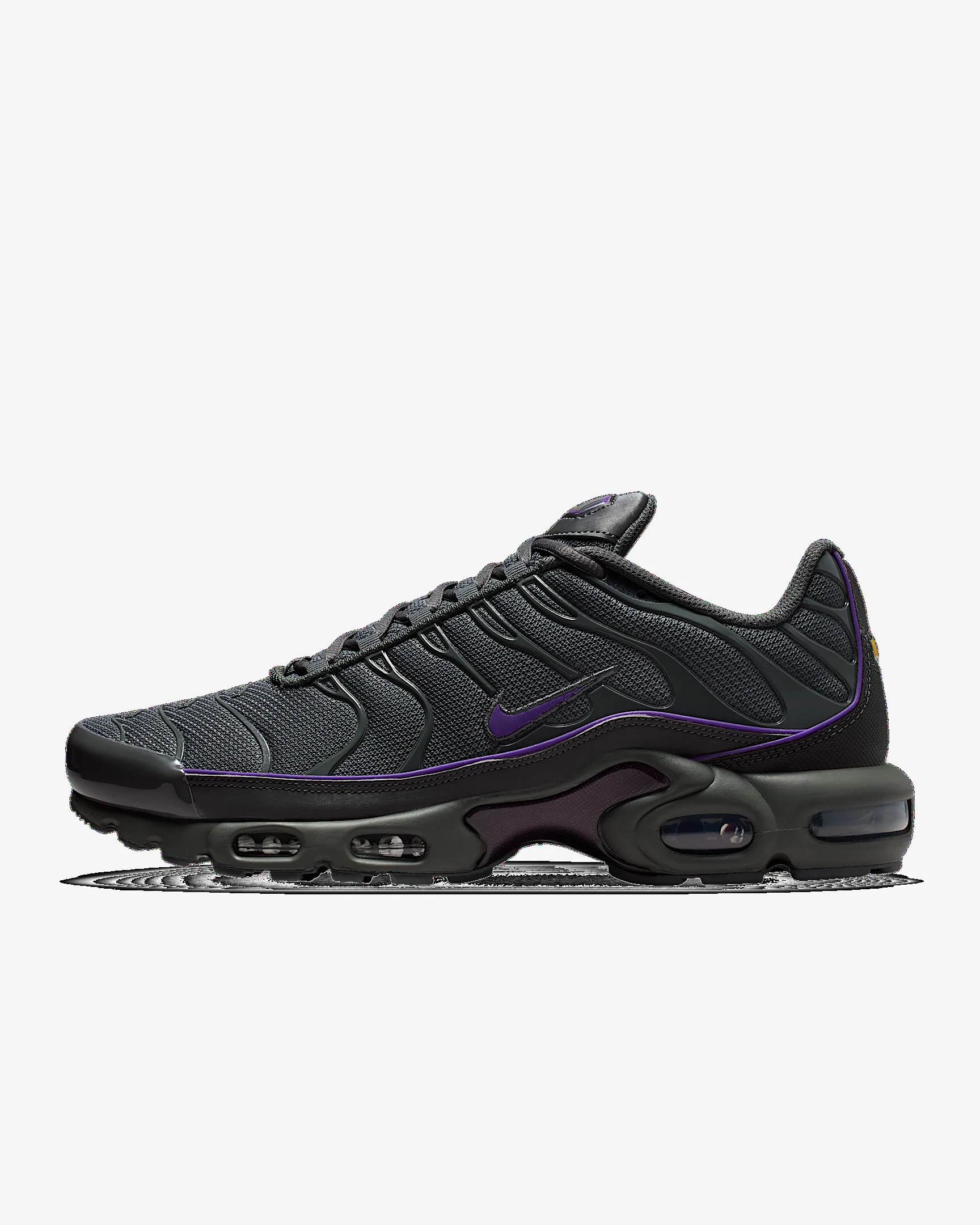 Let your attitude have the edge in the Air Max Plus. Its iconic caging adds heat to your look while airy mesh keeps you cool. And the visible cushioning lets you celebrate your defiant style in comfort. Benefits - Mesh upper with synthetic leather accents is durable and breathable. - Midfoot arch provides a supportive feel. - Nike Air units provide lightweight cushioning. - Rubber outsole gives you durable traction. Product Details - Foam midsole - Rubber outsole - Reflective details - Not intended for use as Personal Protective Equipment (PPE) - Shown: Iron Grey/Iron Grey/Wild Grape - Style: HV8066-001
