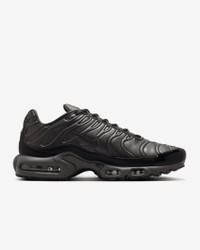 Let your attitude have the edge in this all-black take on the Air Max Plus. Complete with unbelievable cushioning and nature-inspired design details, it lets you celebrate your defiant style in comfort. This premium version mixes synthetic leather with glossy accents for an elevated look. Benefits - Synthetic leather upper with stitched overlays provides durability. - Supportive midfoot arch draws design inspiration from a whale's tail. - Wavy lines of the iconic plastic cage nod to palm trees and ocean waves. - Originally designed for performance running, Nike Air units provide lightweight cushioning. - Rubber outsole gives you durable traction. Product Details - Shown: Black Tea/Petra Brown/Olive Grey/Black - Style: HJ4519-200