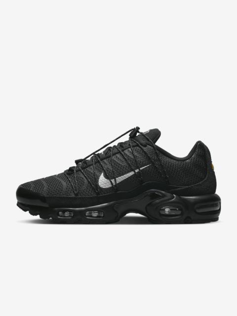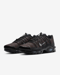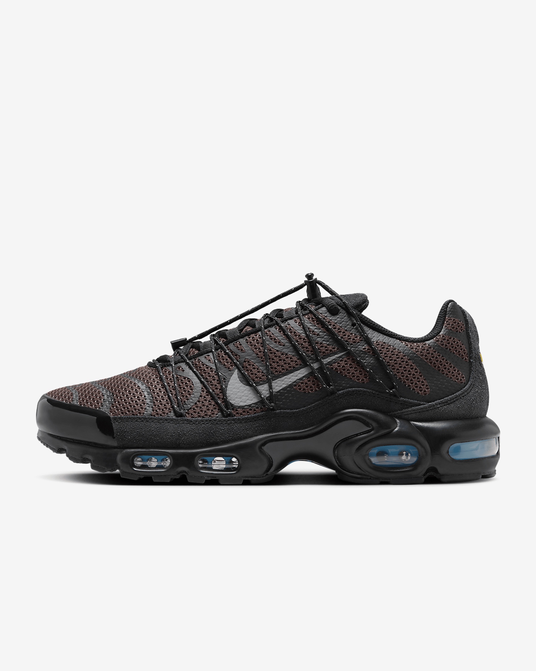 Inspired by the beach but made for city streets, the Nike Air Max Plus Utility gets a rugged upgrade perfect for your urban adventures. We added a sturdy suede mudguard to its breathable knit upper and cinched the look off with an extra set of toggle closure laces for a secure and supportive fit. Plus, visible Max Air units in the forefoot and heel provide a Tuned Air experience that blends comfort with defiant style. Benefits - Extra lace set cinches with a toggle and feeds through loops anchored to the mudguard. - Bringing beach life to the city, the prominent plastic arch on the midsole draws inspiration from a whale's tail and adds structure while wavy lines across the upper nod to palm trees and ocean waves. - Originally designed for performance running, Max Air units provide lightweight cushioning that lasts. - Real and synthetic leather pairs with airy knits and mesh to provide breathability, durability and support. - Rubber outsole gives you durable traction. Product Details - Foam in the midsole - Reflective details - Not intended for use as Personal Protective Equipment (PPE) - Shown: Baroque Brown/Black/University Blue/Black - Style: FD0670-201 SIZE & FIT Fits small; we recommend ordering a half size up