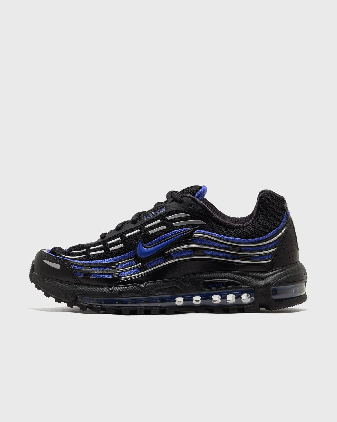 The Nike Air Max TL 2.5 brings back a late '90s classic and reimagines the iconic wavy Air Max look. Lightweight textiles meet supple synthetic leather for a clean look, while full-length Max Air cushioning provides a comfortable, springy feel with every step. - The upper combines mesh with genuine leather and synthetic leather for breathability and durability - Soft, comfortable Max Air cushioning provides just the right amount of support - The rubber outsole provides durable traction Article Number: FZ4110-005 Gender: Men Color: BLACK/HYPER ROYAL-BLACK-MTLC SILVER Material: 30% Rubber, 70% Synthetic/Textile