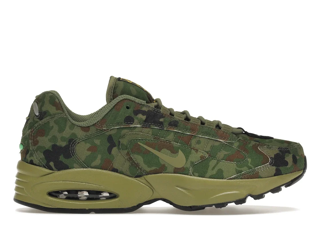 The Nike Air Max Triax 96 Safari Camo reboots the retro running sneaker launched in 1996 and dresses it in a modern aesthetic. The Safari Camo iteration of the Nike Air Max Triax 96 features an upper crafted from ripstop textile and printed with a Camo pattern in black and brown, but primarily shades of green. A lighter green synthetic Nike Swoosh hits the side panel and matches the rope laces, tongue liner, and mesh sock liner. A similar light green forms the foam midsole and the oval midsole frame that highlights the visible ellipse of underfoot Air that offers ultimate cushioning. A black rubber outsole with deep grooves, waffle lugs, and a light green Nike Swoosh underscores this shoe. Our favorite aspect of this retro Camo runner is the eye-catching heel. Three-dimensional pods of white synthetic surround an embossed light green Nike Swoosh in a black diamond, the green pod on the right shoe, and the red pod on the left. The Nike Air Max Triax 96 Safari Camo was released on March 19, 2020, for $150 retail. - Style CT5543-300 - Colorway Safari/Thermal Green-Light Chocolate-Black - Retail Price 150 - Release Date 2020-03-19 - Featured false - Product Line Nike Air Max