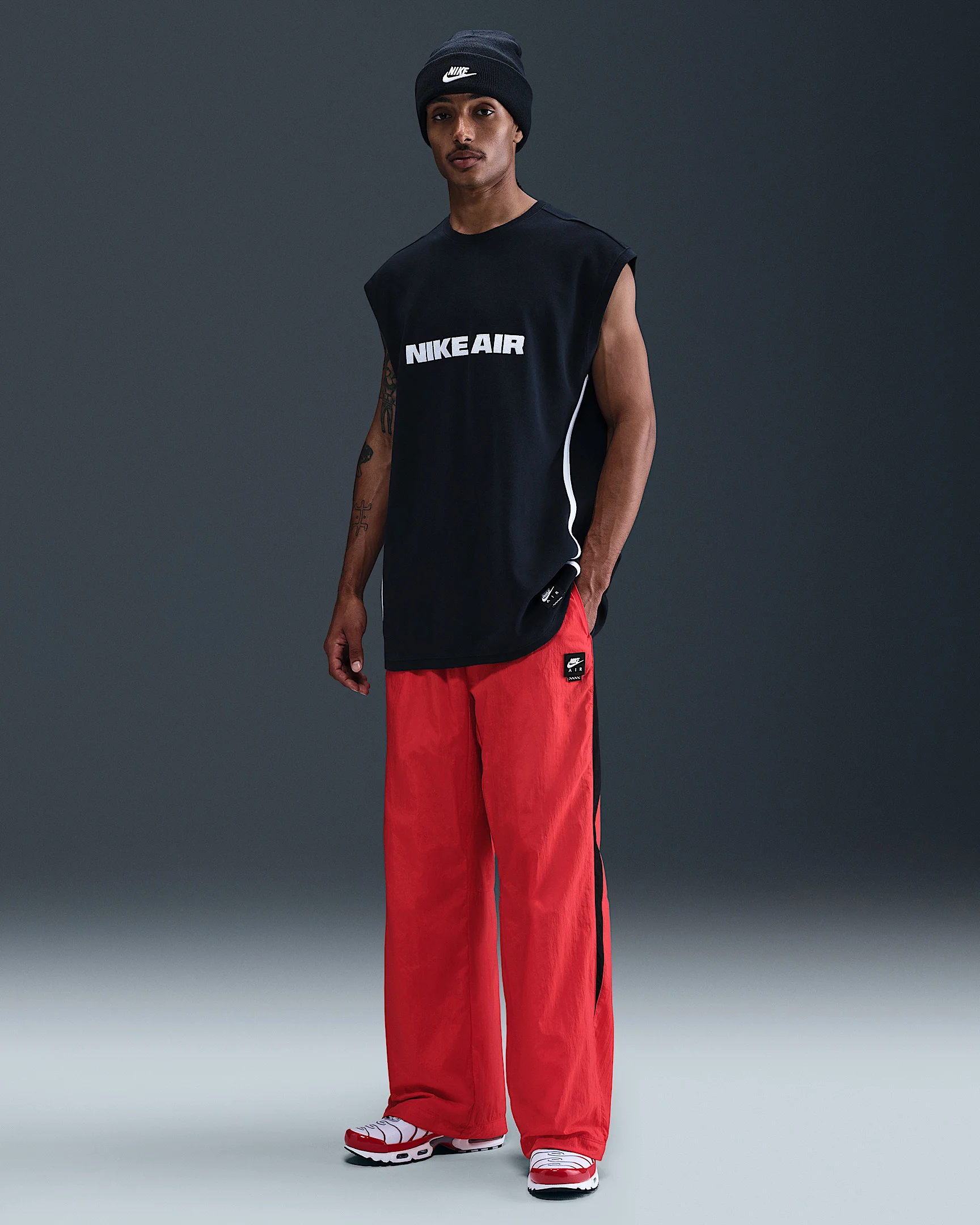 These premium track pants are crafted with water-repellent, swishy fabric and a breathable mesh lining. A roomy, straight-leg fit keeps the comfort flowing all day. Benefits - Loose-fit design with straight legs offers plenty of room for movement through the seat and thighs. - An interior mesh lining adds breathable comfort. - A vertical zippered back pocket pairs with side hand pockets for convenient storage. - An elastic waistband and internal drawcord deliver a comfortable, custom fit at the waist. Product Details - Body: 100% nylon. Lining: 100% polyester. - Machine wash - Imported - Shown: University Red/Black/Black - Style: HV0874-657 SIZE & FIT Model is wearing size M and is 6′1″185cm Loose fit: roomy and relaxed