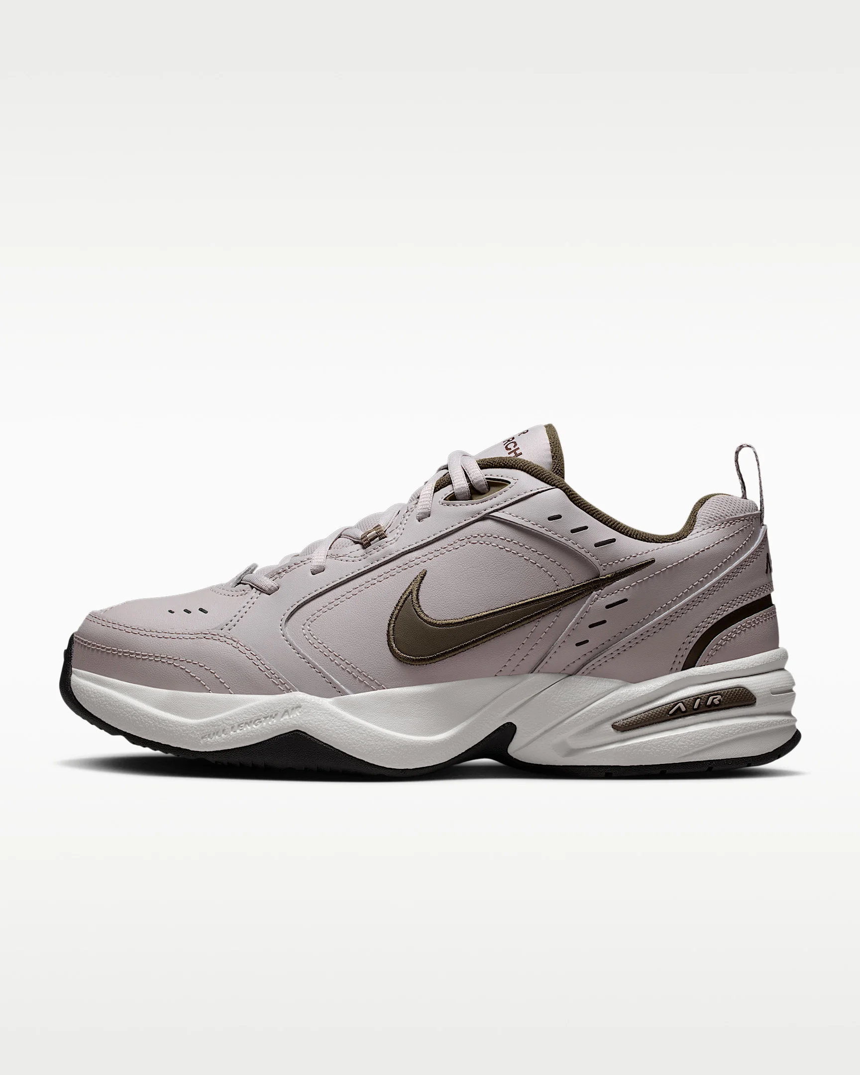 Nike Air Monarch IV sets you up for working out with durable leather on top for support. Lightweight foam teams up with Nike Air cushioning for comfort in every stride. Benefits - Leather and synthetic leather are durable with a classic look. - Full-length encapsulated Air-Sole unit cushions for comfort and support. - Solid rubber sole is durable and provides traction over varied surfaces. Product Details - Shown: Moon Particle/Black/Dark Hazel - Style: 415445-200 SIZE & FIT Fits small; we recommend ordering a half size up