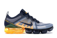 The Nike Air VaporMax 2019 Midnight Navy Laser Orange is an arresting looking sports shoe. Its impressive style is matched only by its innovative high-performance capabilities. The Midnight Navy and Laser Orange colorway of the Nike Air VaporMax 2019 features a lightweight, breathable Nextkin upper in shades of Soft Gray, yellow, and darker gray with overlays of dark blue synthetic. A molded navy heel piece provides structure, as does the synthetic yellow side panel underlay. The navy pull tab on the heel makes it easy to slip this shoe on and pull it off, and the bright yellow Nike Swoosh on the tongue matches the VaporMax branding coursing diagonally across the collar. What our sneaker experts enjoy most about this shoe is the revolutionary TPU midsole that houses full-length VaporMax Air placed directly under the foot. The capsule-shaped pods of the seamless TPU outsole are enhanced with hits of rubber at high pressure points of the foot. The Nike Air VaporMax 2019 Midnight Navy Laser Orange was released on May 30, 2019, for a retail price of $190. - Style AR6631-401 - Colorway Midnight Navy/Midnight Navy-Laser Orange-Obsidian Mist - Retail Price 190 - Release Date 2019-05-30 - Featured false - Product Line Nike Air Max