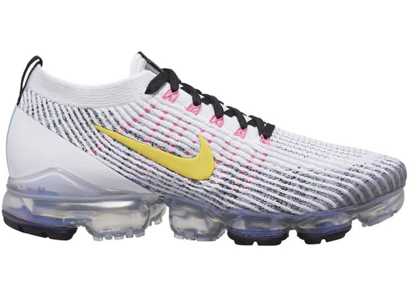 The Nike Air Vapormax 3 White Dynamic Yellow is a sleek and stylish sneaker that combines comfort and performance. The upper is made of breathable mesh and synthetic materials, while the sole features Nike's innovative Vapormax technology for a lightweight and responsive feel. The white base is accented with pops of dynamic yellow on the Swoosh and heel tab, adding a bold touch to the design. Released on April 1, 2019, these sneakers retail for $190. Whether you're hitting the gym or running errands, the Nike Air Vapormax 3 White Dynamic Yellow is a versatile choice that will keep you looking and feeling great. - Style AJ6900-103 - Colorway White/Dynamic Yellow-Hyper Turquoise - Retail Price 190 - Release Date 2019-04-01 - Featured false - Product Line Nike Air Max
