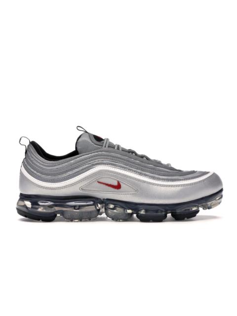 Keep your summer golden with the Air VaporMax 97 Metallic Golds on your feet. Similar to the "Silver Bullet" iteration that released earlier the year, this new colorway carries over all of the signature details from the 1997 original aside from the full-length Air bubble. Instead, the bubble has been replaced with a clear VaporMax unit for superior comfort. These dropped in May of 2018 for $190 and are a must own if AM 97s are your favorite shoes. - Style AJ7291-700 - Colorway Metallic Gold/Varsity Red-Black-White - Retail Price 190 - Release Date 2018-05-17 - Featured false - Product Line Nike Air Max