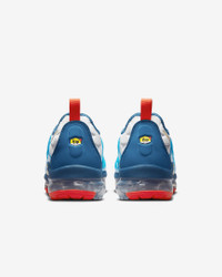 The Nike Air VaporMax Plus looks to the past to propel you into the future. Nodding to the '98 Air Max Plus with its floating cage, padded upper and heel logo, it adds revolutionary VaporMax Air technology to ramp up the comfort and create a modern look. Benefits - VaporMax Air technology provides lightweight cushioning. - Floating plastic cage around the foot draws inspiration from original '98 design. - Cushioned fabric and synthetic material provide durability and comfort. - Rubber pods in high-wear areas of outsole add durability. Product Details - Pull tab on heel - Foam midsole - Not intended for use as Personal Protective Equipment (PPE) - Shown: White/Industrial Blue/Blue Lightning/Citron Pulse - Style: FJ3999-100