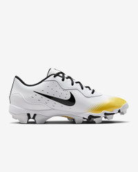 Let the baseball world know what kind of bat-wielding beast you are. The cushy midsole is perfect for sprinting around the bags or robbing your opponent of extra bases in the field. The plush, breathable upper sports a strap that keeps you contained without adding any unnecessary weight. Plus, the grippy rubber cleats are tailor made for all-out effort plays. More Benefits - Mesh on the tongue adds ventilation to help keep your foot cool. - Upper adds ankle support without sacrificing mobility. Product Details - Shown: White/Black/Metallic Gold - Style: DJ6524-119