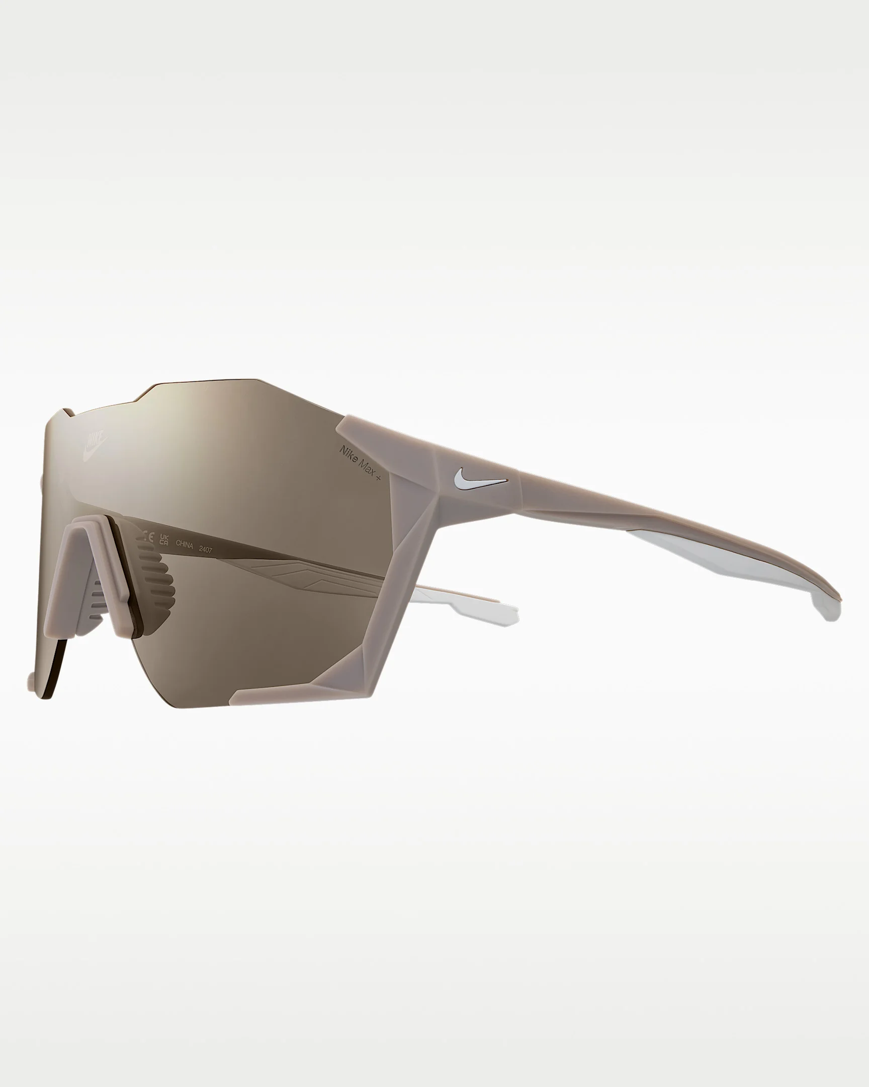 Take your elevated sport style to the streets in the Nike Charged Shield. The futuristic edge detail energizes your look, offering an expansive field of vision for a vast perspective. Designed with minimalism in mind, it features grip zones at the nosepad and temples to ensure a secure, locked-in feel. Benefits - Nike Max + helps reduce light reflection and provides precise vision from all angles. - 5-base curved shield offers medium coverage with moderate peripheral light blockage - Soft, injected rubber inlay nose pads provide stability and grip Product Details - Injected frame material is derived from at least 40% castor bean oil - 100% UVA/UVB protection - Lens Width 61mm – Bridge Width 18mm – Temple Length 140mm - Shown: College Grey - Style: IB3518X-009