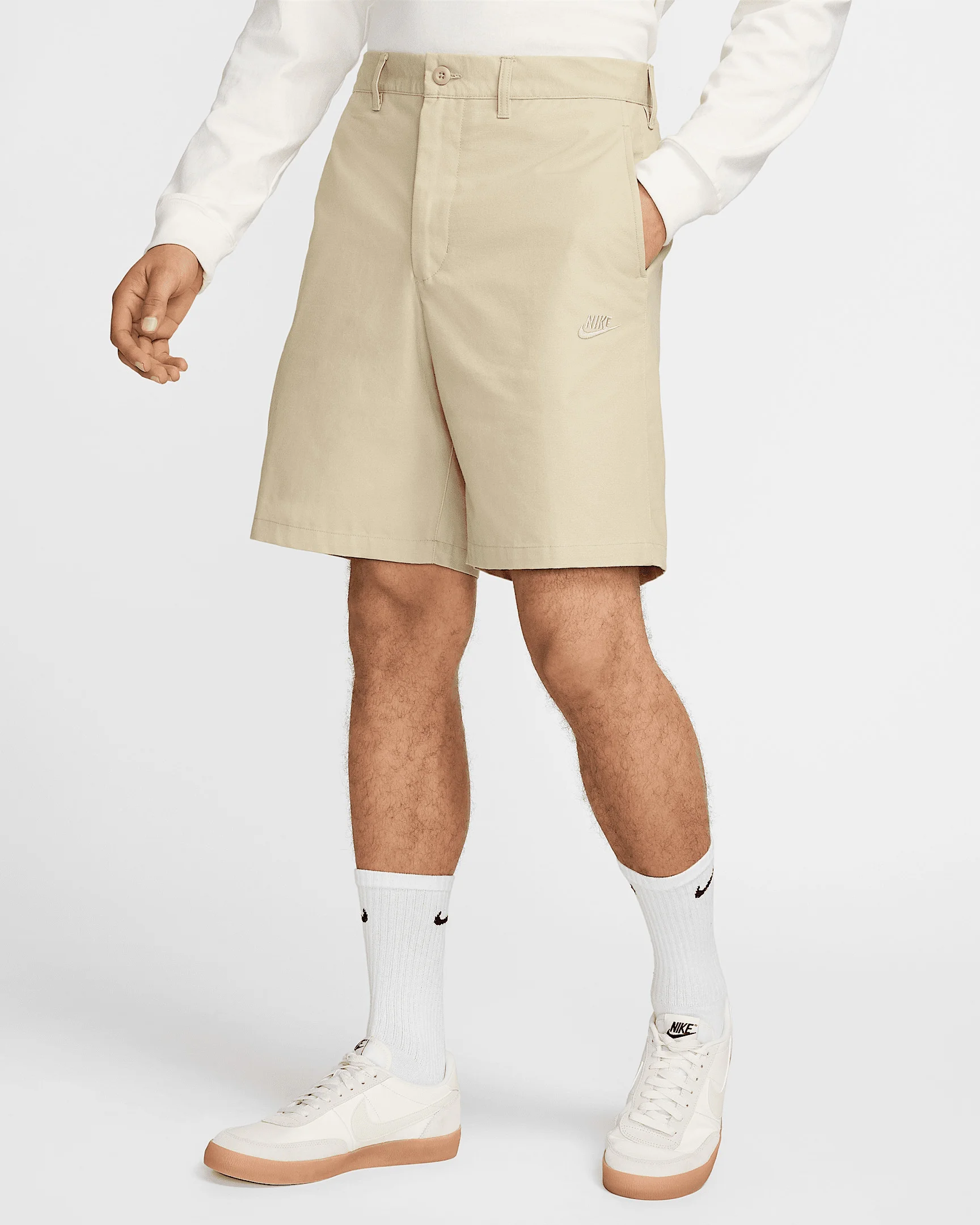 Keep it classic in a pair of these chino shorts from our Nike Club collection. The straight-leg, relaxed fit is designed to feel comfy through the seat and thighs. Pull them on with a polo or tee and your favorite Nike sneakers for a classic look that's ready for some fun in the sun. Benefits - Lightweight woven cotton canvas is durable and breathable. - Designed to feel relaxed through the seat and thighs for everyday comfort. - Belt loops with a zippered fly and button closure help you find the right fit. Product Details - Hand pockets - Back welt pockets - Belt loops - Zipper fly - Woven Nike Futura label at back right pocket - 100% cotton - Machine wash - Imported - Shown: Desert Khaki/Desert Khaki - Style: FZ5772-251 SIZE & FIT Model is wearing size 32 and is 6′1″185cm Standard fit: easy and traditional