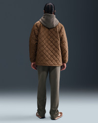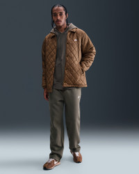 This classic, cool-weather jacket is constructed with quilted woven fabric and Therma-FIT technology. The interior has a smooth lining that adds both comfort and a pop of Nike Club branding. Benefits - Nike Therma-FIT technology helps manage your body’s natural heat to help keep you warm in cold-weather conditions. - The loose fit feels roomy through the body for easy movement and layering. - A bungee with drawcord at the waist lets you switch up the fit. - Lightweight synthetic insulation helps keep you warm in cool conditions. Product Details - Embroidered Nike Futura logo - Snap button front - Body: 100% polyester. Lining: 100% polyester. Fill: 100% polyester. - Machine wash - Imported - Shown: Mosswood Brown/White - Style: HV1377-235 SIZE & FIT Model is wearing size M and is 6′1″185cm Loose fit: roomy and relaxed