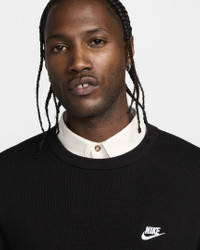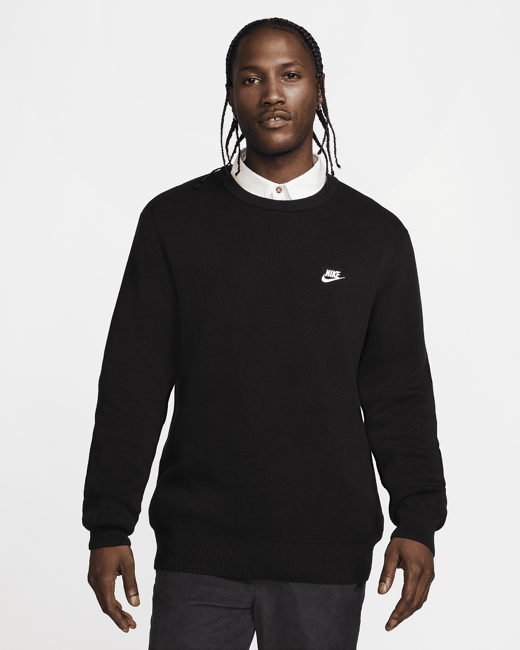 This classic knit sweater offers a clean look and comfortable feel for cool-weather days. The relaxed fit gives you a bit of room to layer and the crew-neck design lets it be paired it up with just about anything. Benefits - Lightweight cotton knit feels plush and warm. - Designed to feel relaxed through the chest and body for an athletic fit you can layer. Product Details - Stretchy Ribbed Openings - Embroidered Nike Futura logo at left chest - 100% cotton - Machine wash - Imported - Shown: Black/White - Style: FQ2912-010 SIZE & FIT Model is wearing size M and is 6′2″188cm Standard fit: easy and traditional