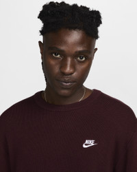 This classic knit sweater offers a clean look and comfortable feel for cool-weather days. The relaxed fit gives you a bit of room to layer and the crew-neck design lets it be paired it up with just about anything. Benefits - Lightweight cotton knit feels plush and warm. - Designed to feel relaxed through the chest and body for an athletic fit you can layer. Product Details - Stretchy Ribbed Openings - Embroidered Nike Futura logo at left chest - 100% cotton - Machine wash - Imported - Shown: Burgundy Crush/White - Style: FQ2912-652 SIZE & FIT Standard fit: easy and traditional