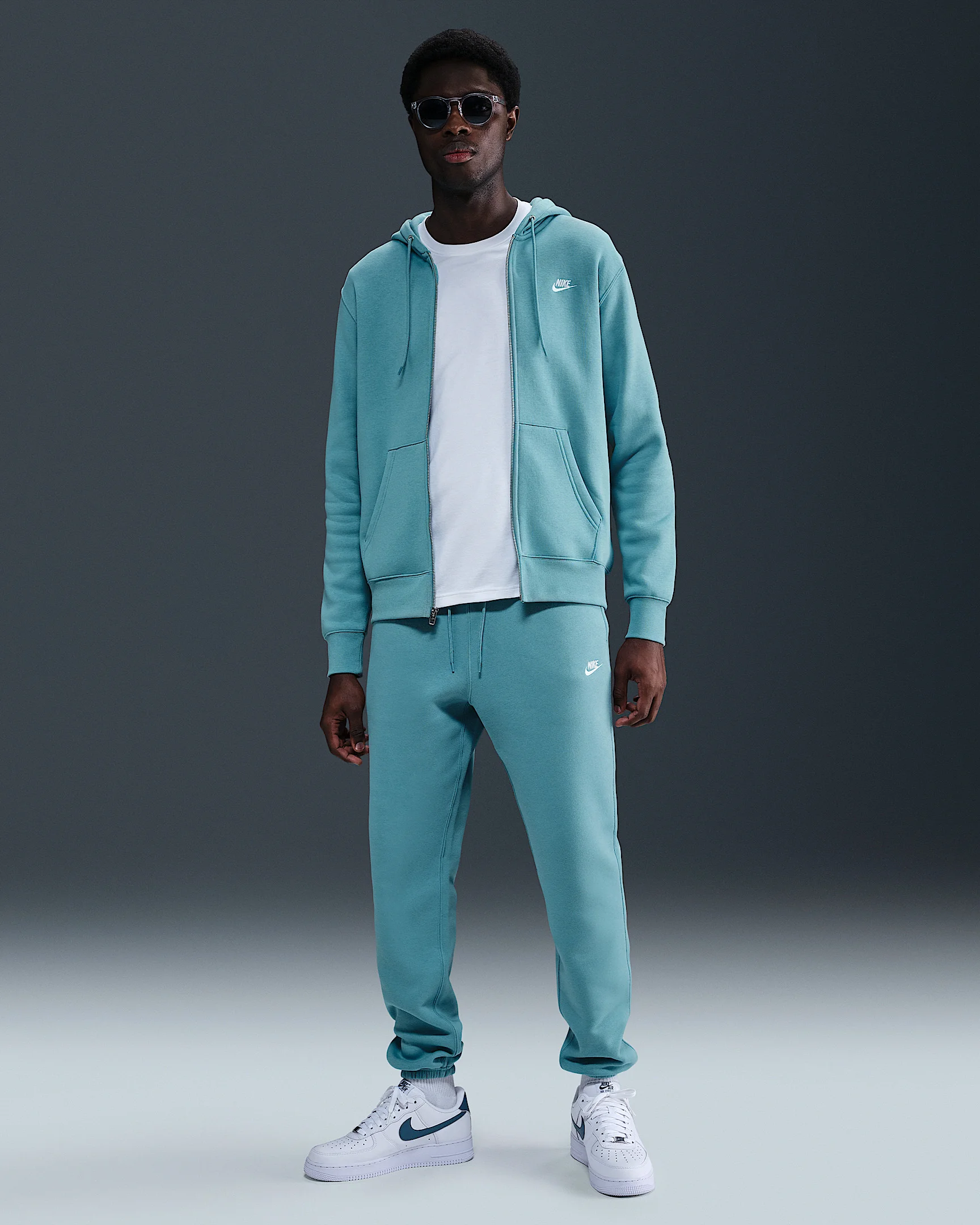 Clean meets casual with these classic sweats. Our midweight brushed fleece feels extra soft on the inside and smooth on the outside. Benefits - The standard fit feels relaxed through the seat and thighs, and tapers towards the ankle. - An elastic waistband and external drawcord deliver a comfortable, custom fit at your waist. - The snap closure back pocket and hand pockets fit most phones. Product Details - Embroidered Nike Futura logo - Body: 80-81% cotton/19-20% polyester. Side pocket knuckle side/Back pocket: 100% cotton. - Material percentages may vary. Check label for actual content. - Machine wash - Imported - Shown: Denim Turquoise/Denim Turquoise/White - Style: FN3808-464 SIZE & FIT Model is wearing size M and is 6′1″185cm Standard fit: easy and traditional
