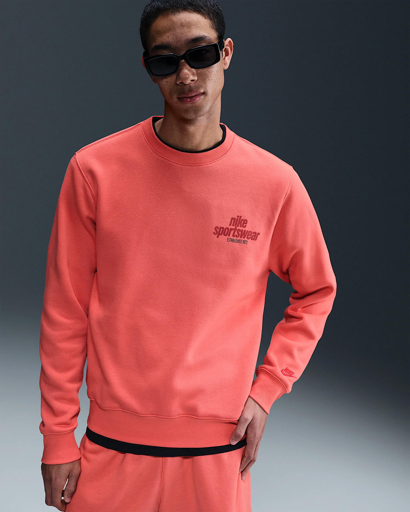 Clean meets casual with this classic crew. Smooth on the outside, super soft on the inside, it delivers comfort you can count on. Benefits - Our midweight brushed fleece feels extra soft on the inside and smooth on the outside, helping you stay cozy while keeping its structured shape. - The standard fit is designed to feel relaxed through the body for easy layering. Product Details - Embroidered Nike Futura logo - 80% cotton/20% polyester - Machine wash - Imported - Shown: Magic Ember/University Red - Style: HJ2173-814 SIZE & FIT Model is wearing size M and is 6′2″188cm Standard fit: easy and traditional