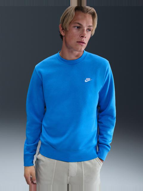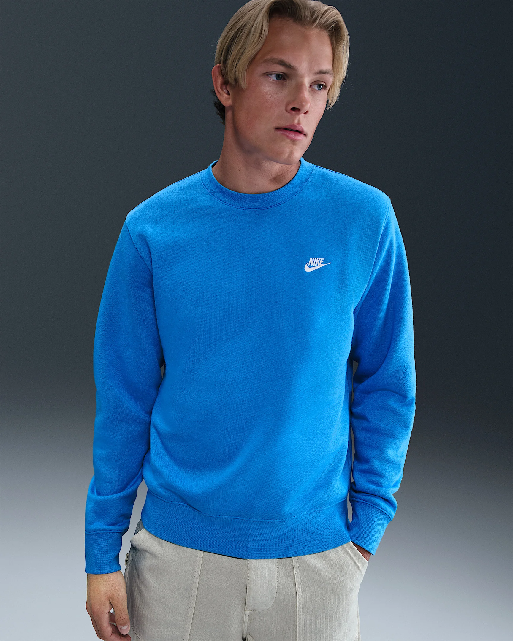 Clean meets casual with this classic crew. Our midweight brushed fleece feels extra soft on the inside and smooth on the outside, helping you stay cozy while keeping its structured shape. Product Details - Embroidered Nike Futura logo - Ribbed cuffs and hem - 67-80% cotton/20-33% polyester. - Material percentages may vary. Check label for actual content. - Machine wash - Imported - Shown: Light Photo Blue/White - Style: FN3886-435 SIZE & FIT Standard fit: easy and traditional