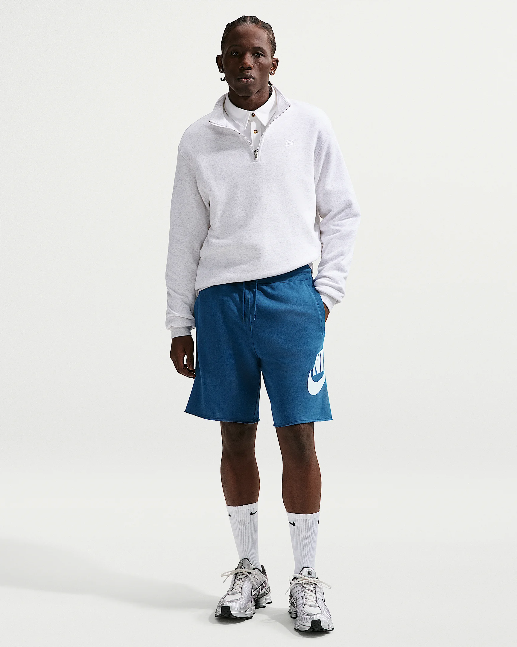 Built with the comfort of Nike Club, these French terry Alumni shorts have a casual cut that's relaxed through the seat and thighs. Benefits - This midweight French terry fabric (with unbrushed loops on the inside) gives structure, breathability and softness—so it's just as ready for the gym as it is for the couch. - A back pocket helps keep your small items secure. Product Details - Hand pockets - Elastic waistband with round external drawcord - 58% cotton/23% rayon/19% polyester. Front pocket: 100% cotton; Waistband: 49% rayon/47% cotton/4% spandex. - Machine wash - Imported - Shown: Court Blue/Court Blue/White - Style: FQ4950-476 SIZE & FIT Big & Tall model is wearing size 2XL and is 6'5"196cm Standard fit: easy and traditional