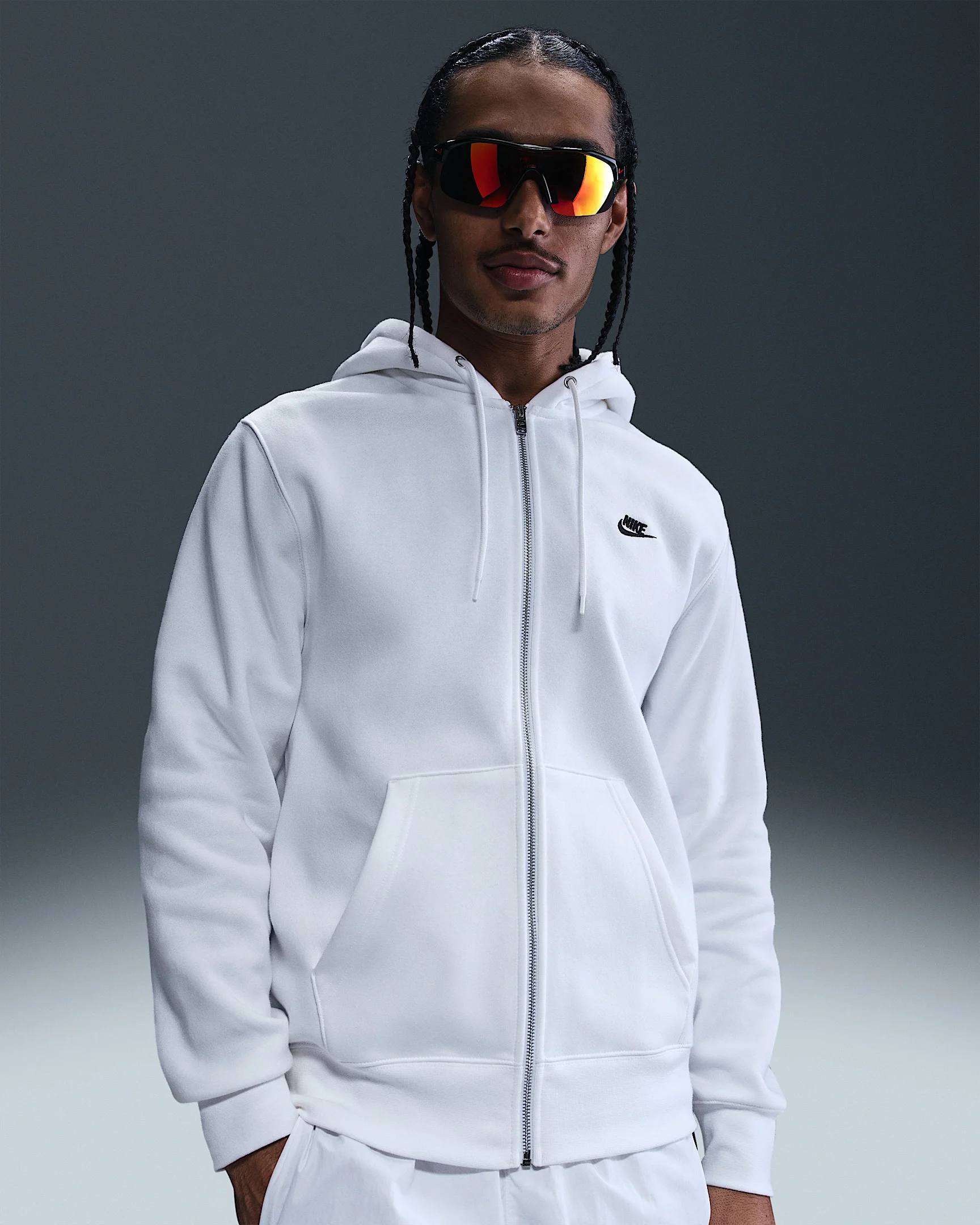 Clean meets casual with this classic hoodie. Smooth on the outside, super soft on the inside, this brushed fleece sweatshirt delivers comfort you can count on. Benefits - Our midweight brushed fleece feels extra soft on the inside and smooth on the outside, helping you stay cozy while keeping its structured shape. - The standard fit is designed to feel relaxed through the body for easy layering. - Double-layer hood has a round braided drawcord to make finding the right fit a cinch. Product Details - Embroidered Nike Futura Logo - Divided pouch pocket - Ribbed hem and cuffs - Metal Zipper - Body: 67-80% cotton/20-33% polyester. Hood lining: 67-80% cotton/20-33% polyester. - Material percentages may vary. Check label for actual content. - Machine wash - Imported - Shown: White/White/Black - Style: FN3861-100 SIZE & FIT Model is wearing size M and is 6′1″185cm Big & Tall model is wearing size 3XL and is 6'6"198cm Standard fit: easy and traditional