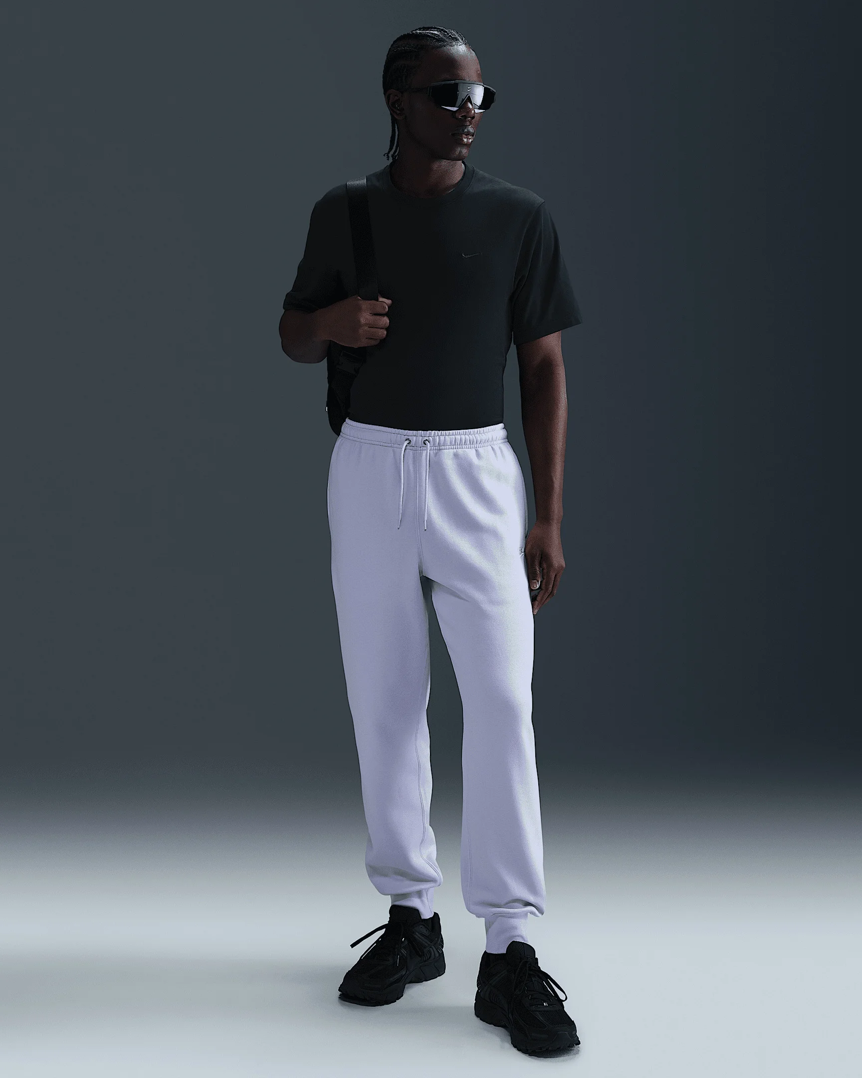 Clean meets casual with these classic joggers. Our midweight brushed fleece feels extra soft on the inside and smooth on the outside. Benefits - Their standard fit feels relaxed through the seat and thighs and tapers towards the ankle. - An elastic waistband and external drawcord deliver a comfortable, custom fit at your waist. - The snap closure back welt pocket and hand pockets fit most phones. Product Details - Embroidered Nike Futura logo - Body: 67-81% cotton/19-33% polyester. Side pocket knuckle side/Back pocket: 100% cotton. - Material percentages may vary. Check label for actual content. - Machine wash - Imported - Shown: Amethyst Tint/Amethyst Tint/White - Style: FN3787-538 SIZE & FIT Model is wearing size M and is 6′1″185cm Big & Tall model is wearing size 2XL and is 6'2"188cm Standard fit: easy and traditional