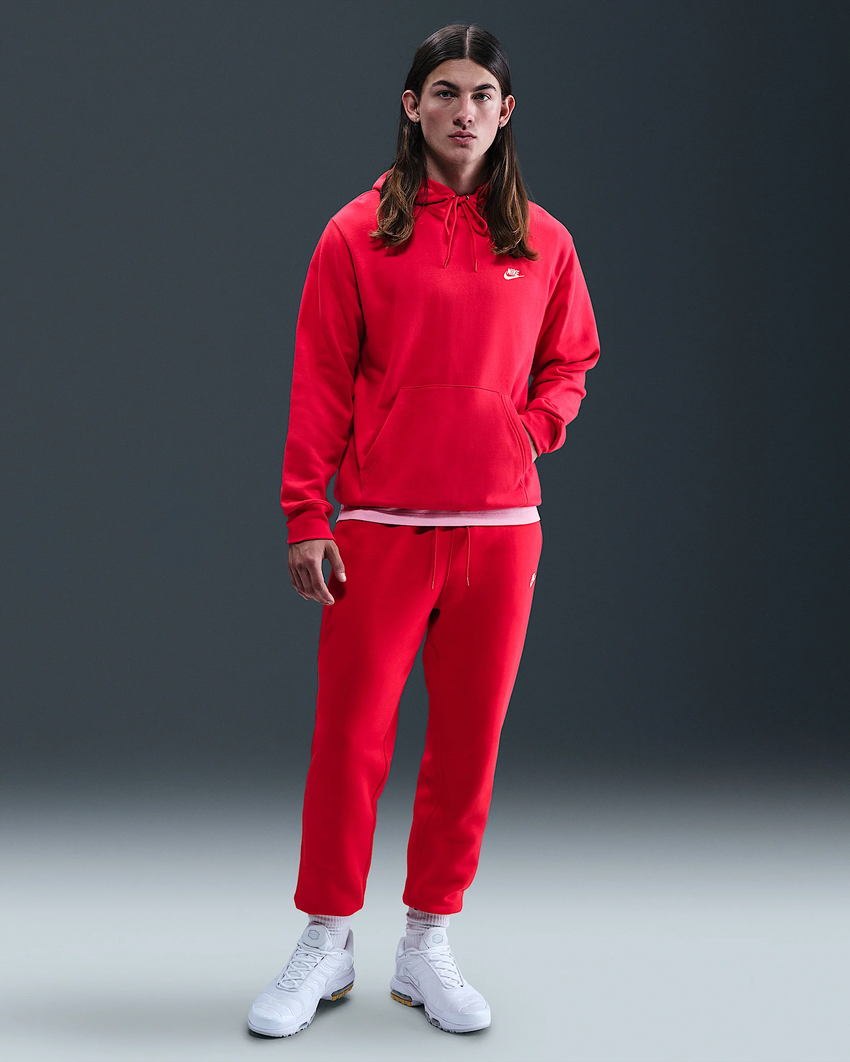 Clean meets casual with these classic joggers. Our midweight brushed fleece feels extra soft on the inside and smooth on the outside. Benefits - Their standard fit feels relaxed through the seat and thighs and tapers towards the ankle. - An elastic waistband and external drawcord deliver a comfortable, custom fit at your waist. - The snap closure back welt pocket and hand pockets fit most phones. Product Details - Embroidered Nike Futura logo - Body: 67-81% cotton/19-33% polyester. Side pocket knuckle side/Back pocket: 100% cotton. - Material percentages may vary. Check label for actual content. - Machine wash - Imported - Shown: University Red/University Red/White - Style: FN3787-657 SIZE & FIT Model is wearing size M and is 6′1″185cm Standard fit: easy and traditional