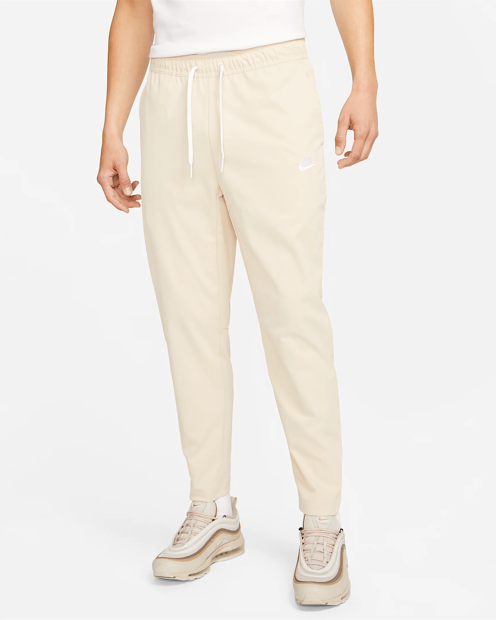 Comfort and style, that’s the ethos behind our woven Nike Club pants. They’re made to move, with shaping that follows your body and a flexible waistband. Plus, they have a tapered design and modern fit perfect for all your daily routines and outings. Benefits - Soft woven twill fabric is comfortable and flexible. - Paneled construction is designed to follow the shape of your legs for less restriction during movement. - Soft elastic waistband with external drawcord gives you comfort and adjustability. Product Details - Tapered open hem - Hand pockets - Back pockets - 100% polyester - Machine wash - Imported - Shown: Sanddrift/White - Style: DX0623-126 SIZE & FIT Model is wearing size M and is 6′2″188cm Standard fit: easy and traditional