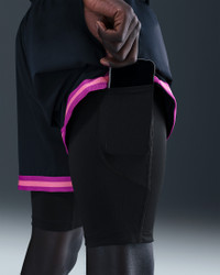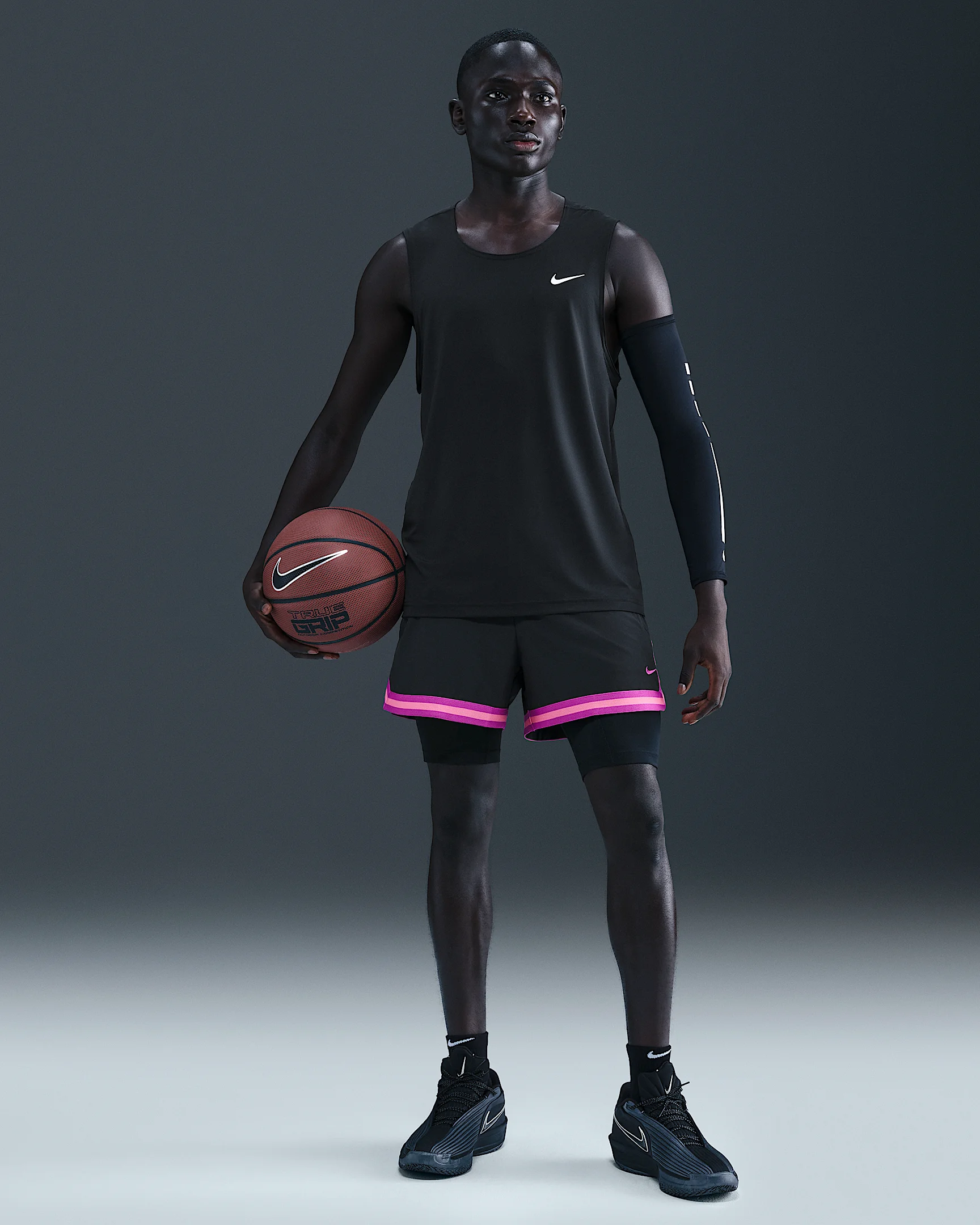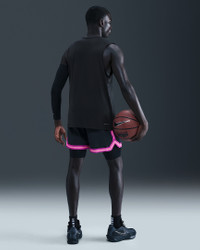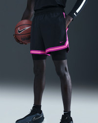 These 2-in-1 shorts pair breathability and support to give you functional comfort on the court. A lightweight, sweat-wicking outer short pairs with an inner tight to keep you focused on achieving your best. More Benefits - Designed for basketball - 4" inseam - Inner short - Lightweight, sweat-wicking fabric with mesh face and smooth interior - Side pockets and zippered utility pocket large enough for a phone - Elastic waistband with drawcord Product Details - Body: 86% polyester/14% spandex. Tight: 90% polyester/10% spandex. Tight center front lining: 92% polyester/8% spandex. - Machine wash - Imported - Shown: Black/Vivid Purple - Style: HJ4233-011 SIZE & FIT Model is wearing size M and is 6′1″184cm Standard fit: easy and traditional